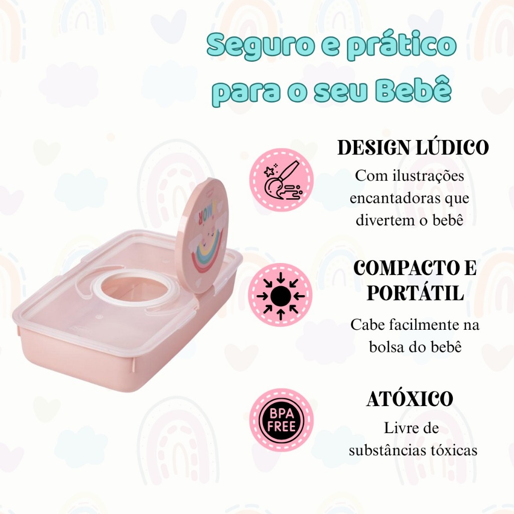 Mantenha os lenços umedecidos do seu bebê sempre à mão e frescos com nosso adorável Porta Lenço Umedecido Este recipiente prático e portátil é a solução perfeita para pais que buscam organização e conveniência. Chega de lenços secos ou pacotes abertos na bolsa! Características e Benefícios: Design Encantador: Com um lindo desenho e a cor rosa suave, é perfeito para o enxoval do seu bebê e adiciona um toque de alegria ao dia a dia. Frescor Garantido: A tampa com vedação segura mantém os lenços umedecidos frescos e úmidos por mais tempo, evitando o ressecamento. Praticidade no Dia a Dia: Ideal para usar em casa, na bolsa de maternidade, no carro ou em viagens. Tenha sempre um lenço à disposição para trocas de fralda, limpeza de mãos e rostos. Fácil de Recarregar: A abertura superior facilita a reposição dos lenços umedecidos de forma rápida e descomplicada. Material Durável e Seguro: Fabricado com material resistente e livre de substâncias nocivas, garantindo a segurança do seu bebê. Portátil e Leve: Seu tamanho compacto permite que seja facilmente transportado para qualquer lugar, sem ocupar muito espaço. Especificações Técnicas: Material: Plástico resistente (PP) Desenho: Arco-Íris, Ursa, Raposa, Astronauta, Urso, Bichinho Azul, Mickey ou Minnie Dimensões aproximadas: 19,5 cm x 11,5 cm x 4 cm Capacidade: Compatível com a maioria dos pacotes de lenços umedecidos Conteúdo da Embalagem: 1 Porta Lenço Umedecido com Tampa Ideal para: Pais de bebês e crianças pequenas Uso em casa, creche, viagens e passeios Organizar e manter os lenços umedecidos sempre à mão ✨ Lenço Umedecido Prático, higiênico e indispensável no dia a dia! Os lenços umedecidos oferecem limpeza rápida e suave, ajudando a remover impurezas sem irritar a pele. Além de deixarem uma sensação de frescor, são ideais para uso em bebês, crianças e adultos, seja em casa ou fora dela. Podem conter propriedades hidratantes, calmantes e antibacterianas, garantindo cuidado e proteção em qualquer momento. Garanta já o seu Porta Lenço Umedecido e desfrute de mais praticidade e organização no cuidado do seu bebê!