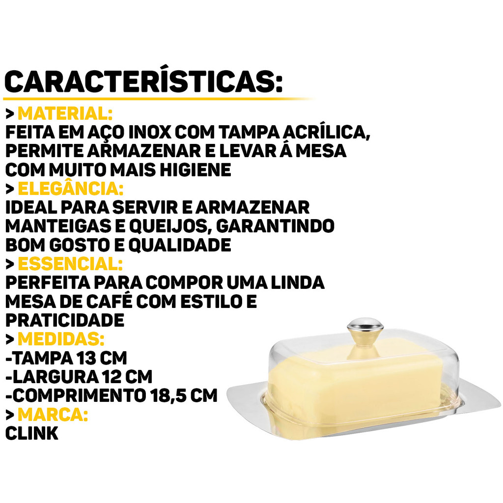 Porta Manteiga Margarina Aço Inox Com Tampa Acrílico Manteigueira Retangular