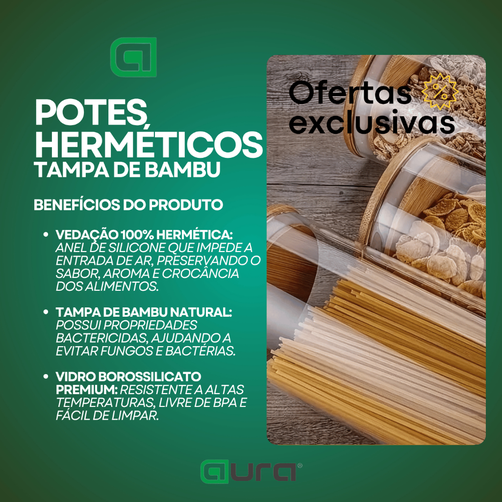 Conjunto 4 Potes Herméticos com Tampa de Bambu – Vidro Borossilicato Premium Mantenha sua cozinha organizada e elegante com o Kit de Potes Herméticos com Tampa de Bambu. Desenvolvidos para conservar alimentos secos com mais frescor e praticidade, esses potes unem design moderno, vedação perfeita e materiais sustentáveis. Benefícios do Produto Vedação 100% Hermética: Anel de silicone que impede a entrada de ar, preservando o sabor, aroma e crocância dos alimentos. Tampa de Bambu Natural: Possui propriedades bactericidas, ajudando a evitar fungos e bactérias. Vidro Borossilicato Premium: Resistente a altas temperaturas, livre de BPA e fácil de limpar. Beleza e Funcionalidade: Ideal para armazenar grãos, temperos, farinhas, biscoitos, café, macarrão, cereais, snacks e muito mais. Design Sustentável: Une estética sofisticada com cuidado ao meio ambiente. Material: Vidro borossilicato e tampa de bambu com vedação em silicone Cor: Transparente com tampa natural Marca: Aura do Brasil Origem: Importado Dimensões dos Potes Pote 1: 12 cm (A) x 10 cm (L) – 0,8L Pote 2: 15 cm (A) x 10 cm (L) – 1,1L Pote 3: 20 cm (A) x 10 cm (L) – 1,5L Pote 4: 25 cm (A) x 10 cm (L) – 1,8L