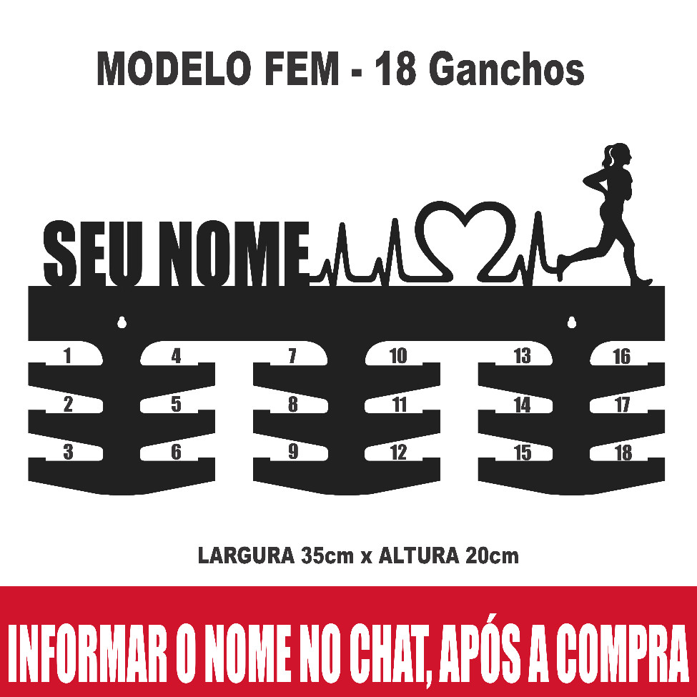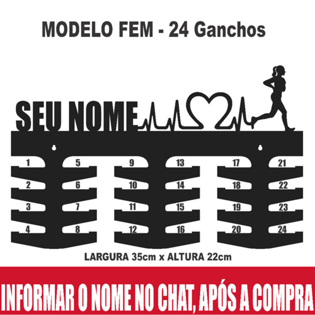 Porta Medalhas Corrida Com Nome Feminino & Masculino MDF Vazado ****** Modelos e Tamanhos ***** ** 12 Ganchos - MDF 3mm **** TAMANHO - Largura 35cm X Atura 17cm ** ** 18 Ganchos - MDF 3mm **** TAMANHO - Largura 35cm X Atura 20cm ** ** 24 Ganchos - MDF 3mm **** TAMANHO - Largura 35cm X Atura 22cm ** ** 36 Ganchos - MDF 6mm **** TAMANHO - Largura 35cm X Atura 27cm ** ** 48 Ganchos - MDF 6mm **** TAMANHO - Largura 35cm X Atura 27cm ** PRODUTO: - MATERIAL: MDF - ESPESSURA: MODELO 12 - 18 - 24 GANCHOS 3mm e MODELOS 36 - 48 GANCHOS 6mm. - ACABAMENTO: Preto Fosco - FUNDO: Produto vazado, não possuí fundo. Corte à laser, possuí as bordas com acabamento perfeito. INSTALAÇÃO: - O produto será fixado com uma fita dupla face (3M) que será enviada junto ao seu produto. - Recomendamos a utilização de parafusos para fixação. Item não enviado. - O produto só deve ser aplicado em superfícies que sejam totalmente lisas e foscas, sem nenhum indício de textura, irregularidades ou brilho.