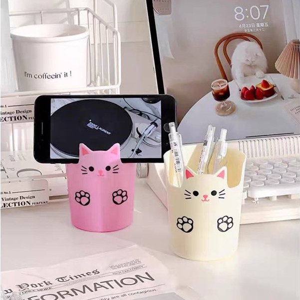 Porta Objetos Gatinho com Suporte para Celular 10,5cm em Plástico Organizador Lapis Caneta Gato