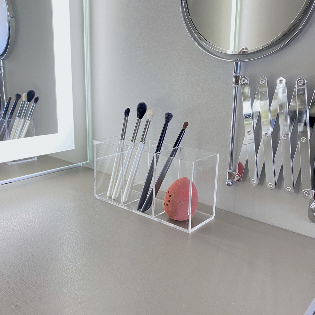Porta pinceis para maquiagem transparente Este suporte é muito prático, pois você pode arrumar seus pincéis separadamente de acordo com a sua função, como pincéis de base, de blush, de sombra, e pincéis para aplicação de batom, permitindo, que sejam visualizados todas as variedades na hora de aplicar a maquiagem. Descrição do produto Material: a Acrihome Design em Acrílicos trabalha com acrílico cristal transparente (cast) de excelente qualidade que não possui manchas e nem amarela com tempo. Dimensões - Comprimento: 18 cm - Largura: 6,5 cm - Altura: 9,5 cm - Espessura do acrílico: 3 mm