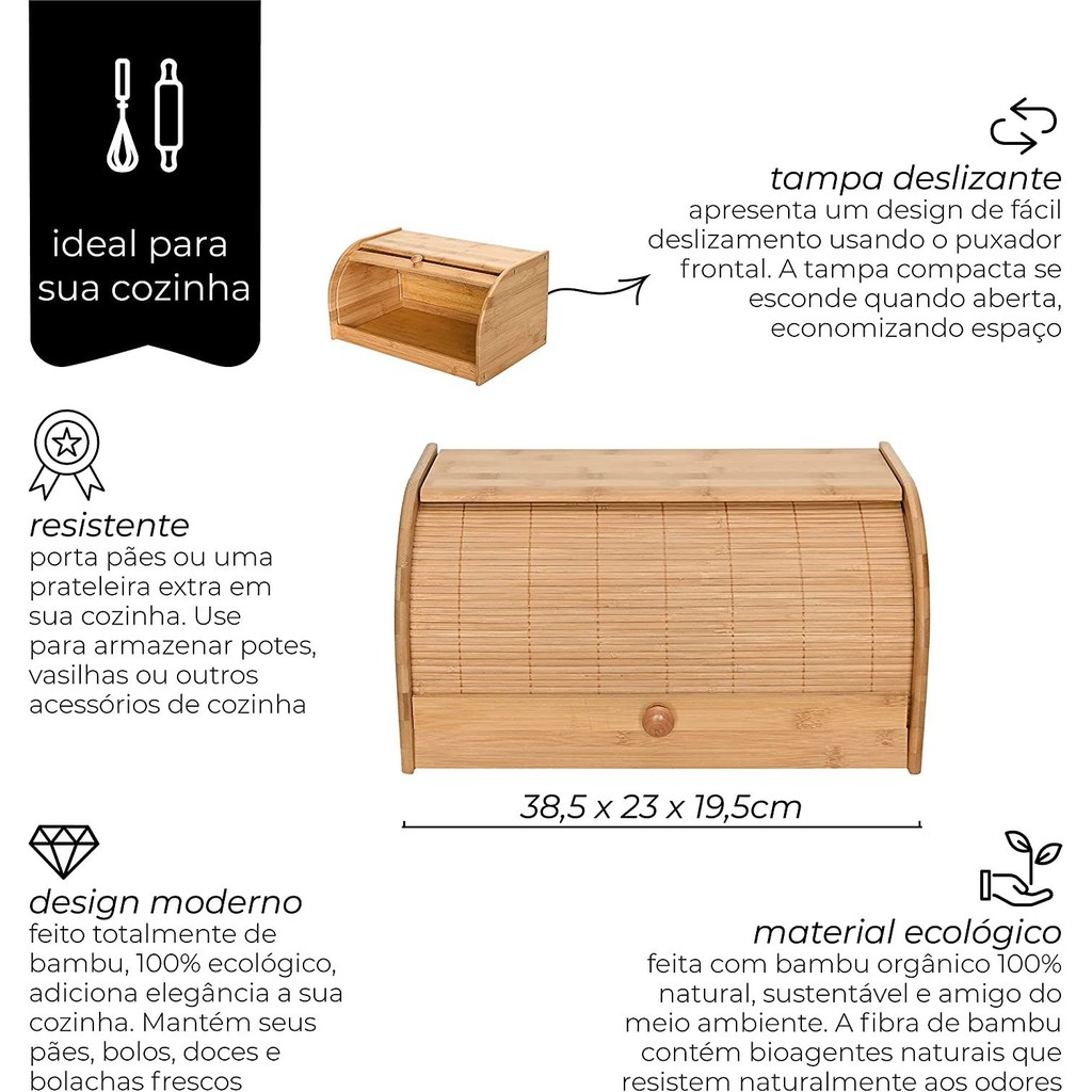 ATENÇÃO: O MODELO DA TAMPA SERÁ ENVIADO CONFORME DISPONIBILIDADE DO FABRICANTE. Porta Paes Com Tampa Retratil de Bambu Ecokitchen Mimo Style MATERIAL DE QUALIDADE: Este porta pães e feito de bambu orgânico de alta qualidade que e hipoalergênico, durável e resistente a manchas e odores. Combina facilmente com a decoração da sua cozinha ou sala de jantar. Adiciona elegância a decoração da sua cozinha DESIGN: Feito totalmente de bambu, 100% ecológico, adiciona elegância a sua cozinha. Mantém seus pães, bolos, doces e bolachas frescos. Medidas: C- 38,5cm L-23cm A-19,5cm TAMPA DESLIZANTE: A tampa apresenta um design de facil deslizamento usando o puxador frontal. A tampa compacta se esconde quando aberta, economizando espaco. Sempre feche a tampa para manter os paes, bolos, doces ou biscoitos frescos ao longo dos dias RESISTENTE: Use nosso porta paes como uma prateleira de cozinha adicional para uma organizacao simplificada. E muito resistente e pode tambem armazenar potes e vasilhas ou outros acessorios de cozinha no topo. Com nosso porta paes voce economiza espaco precioso na sua cozinha FACIL HIGIENIZACAO: Limpe com um sabao neutro e agua usando um pano umido. Mudancas extremas de temperatura, umidade e secura podem afetar o bambu, portanto recomendamos deixa-la em um local bem ventilado e longe do calor direto ou da luz solar Necessita montagem para uso, acompanha instrucoes de montagem. Ele e ideal para voce, fabricado em bambu, material leve, duravel, resistente e 100% ecologico. Design Rustico que se encaixam na decoracao do seu ambiente. BENEFICIOS: -Material Resistente - 100% Ecologico - Tampa Basculante - Facil Montagem - Acompanha mini chave para montagem -Design Inovador Dimensoes Aproximadas da Embalagem (AxLxC): 5,5 x 26 x 40 cm Dimensoes Aproximadas do Produto: 20 cm altura 38 cm largura 23 cm comprimento Obs.: O produto é da cor que está na primeira foto, modelo da tampa será enviado conforme disponibilidade no estoque.
