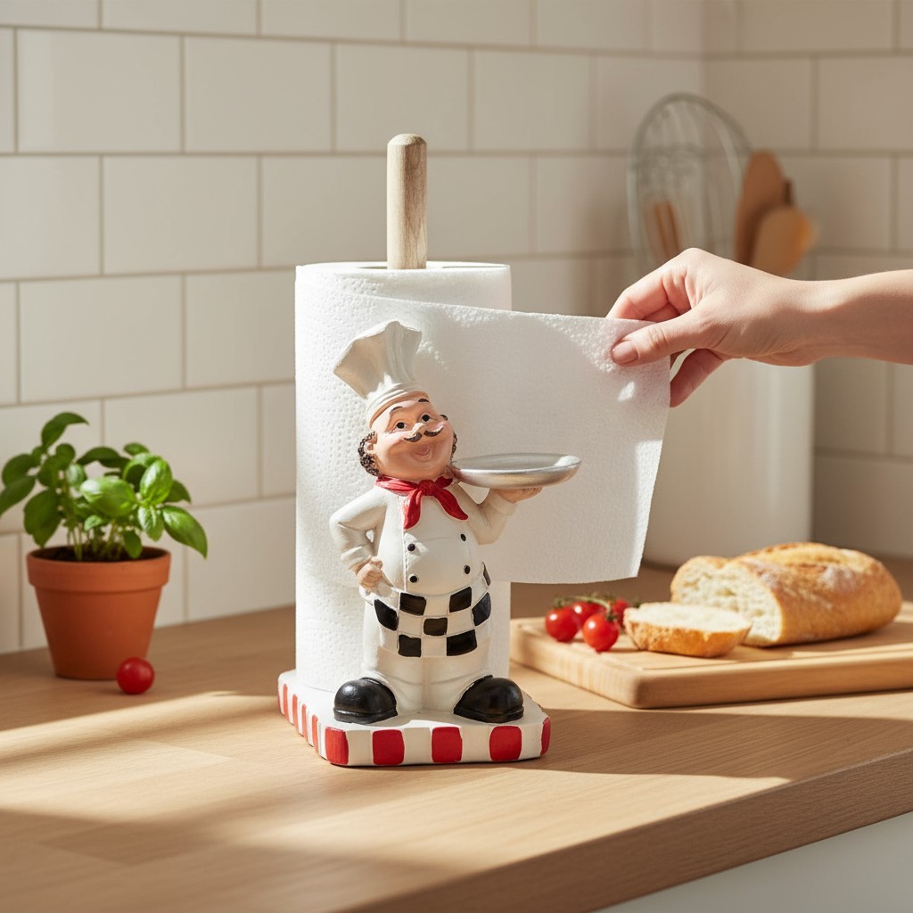 Deixe sua cozinha mais charmosa e organizada com este porta papel toalha decorativo no estilo Chef! Tamanho: 29 x 15 x 10 cm Com design divertido e acabamento caprichado, ele une funcionalidade e decoração, trazendo um toque acolhedor para o seu ambiente. A base é feita em resina resistente, detalhada e bem estruturada, enquanto a haste é em madeira, garantindo estabilidade e fácil reposição do papel toalha. Ideal para cozinhas, cantinhos gourmets e mesas decoradas. Destaques do Produto: - Design Decorativo: Chef sorridente com acabamento detalhado em resina. - Material de Qualidade: Base em resina resistente e haste de madeira. - Funcional e Estável: Mantém o papel toalha firme e acessível no dia a dia. - Fácil de Usar: Basta retirar a haste e reposicionar o rolo de papel. - Decoração Gourmet: Deixa a cozinha mais charmosa, divertida e personalizada. Ideal para: Cozinhas Cantinho do café Áreas gourmets Presentes criativos Dê um toque especial à sua cozinha com esse porta papel toalha estilo chef – funcional, criativo e cheio de personalidade!