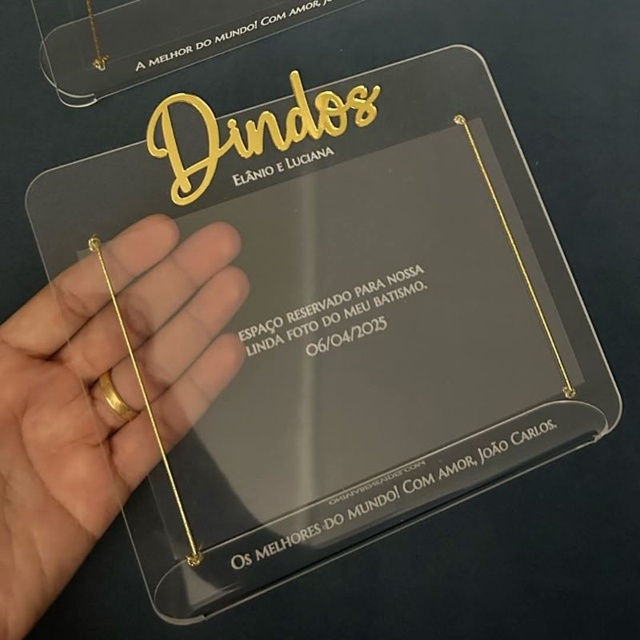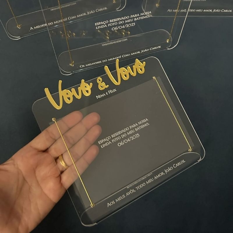 **Porta-Retrato em Acrílico Personalizado – Lembrança Especial para Avós, Batizado, Crisma, Datas Comemorativas** Transforme momentos especiais em lembranças eternas com nosso porta-retrato em acrílico personalizado! Ideal para presentear avós, padrinhos, pais ou aquela pessoa querida em datas como batizados, aniversários, Dia dos Avós e muito mais. **Detalhes do produto:** - Material: Acrílico cristal de alta qualidade - Tamanho: 17x12 cm - Personalização com nome e frase especial - Impressão a laser: durabilidade e acabamento impecável - Suporte com cordão dourado (ou conforme imagem) - Espaço reservado para colar sua foto favorita **Sugestões de uso:** - Lembrancinha de batizado - Presente de Dia dos Avós - Aniversário de familiares - Datas comemorativas religiosas - Presente afetivo e exclusivo **Como personalizar:** Após a compra, envie os dados para personalização via chat: - Nome(s) dos presenteados - Nome do bebê/criança - Frase personalizada (ou usamos uma frase padrão) **Prazo de produção:** até 3 dias úteis após confirmação dos dados.