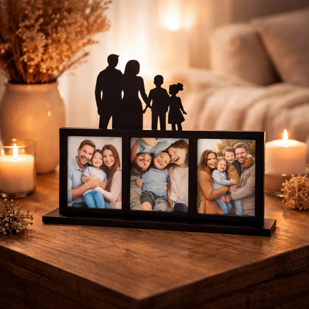 🖤 Porta-Retratos Família em MDF com Silhueta – Decoração Moderna O Porta-Retratos Família em MDF com Silhueta é um item decorativo pensado para quem valoriza bons momentos e gosta de ambientes organizados, modernos e acolhedores. Seu design elegante transforma fotos de família em um destaque visual que combina com qualquer estilo de decoração. Produzido em MDF com corte a laser, apresenta acabamento preciso e visual sofisticado, ideal para uso em mesas, aparadores, estantes e racks. ✔ Benefícios do Produto Valoriza fotos de família de forma elegante Design moderno e discreto Ocupa pouco espaço Fácil de combinar com outros itens decorativos Ideal para uso residencial ou como presente 🛠 Especificações Material: MDF Espessura: 2,5 mm Acabamento: Preto Corte: Laser de alta precisão Capacidade: 3 fotos Uso: decorativo 🏡 Ambientes Indicados Sala de estar Quarto Escritório Hall de entrada Home office 🎁 Ótima Opção de Presente Indicado para: Dia das Mães Dia dos Pais Aniversários Natal Presente para família ou casal 📦 Observações Produto decorativo Fotos ilustrativas As fotos podem ser trocadas facilmente Envio seguro e bem embalado