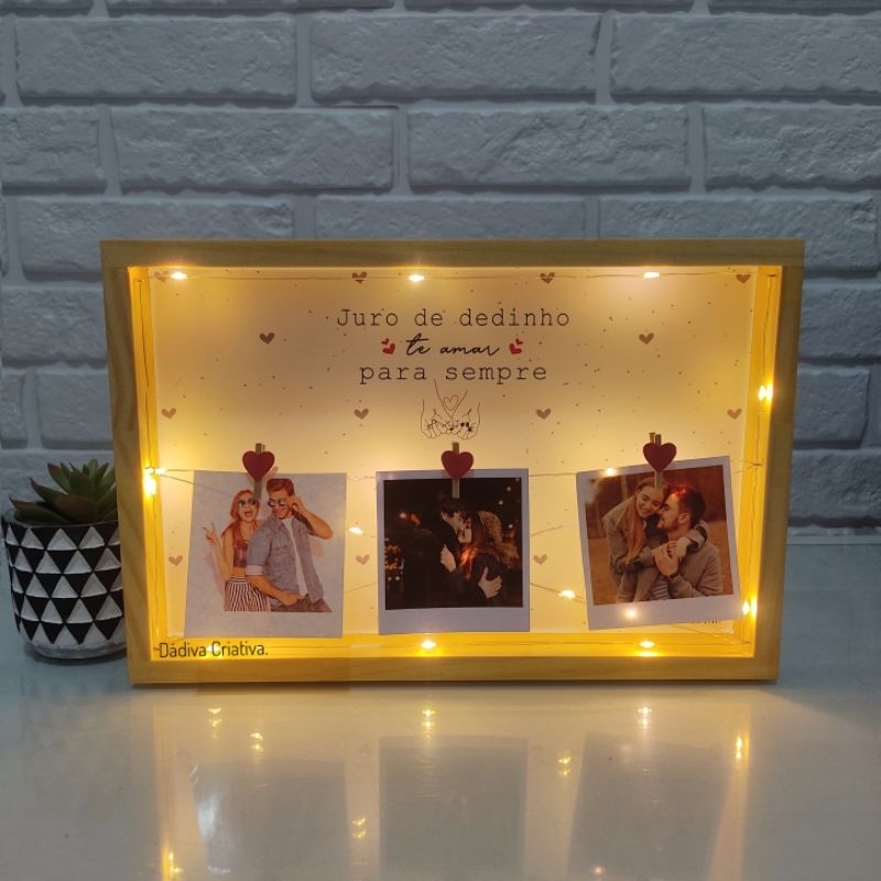DESCRIÇÃO: Porta-retrato com led, já acompanha as fotos e já vai embrulhado, prontinho para presentear. 🎁✨ Por se tratar de um produto artesanal, damos um prazo de até 5 dias úteis para a postagem. ⚠️ ATENÇÃO⚠️ Temos um curto prazo de envio, pedimos a gentileza que nos envie as fotos o quanto antes, para que o pedido não siga sem. ⚠️ NESTE ANÚNCIO NÃO FAZEMOS ALTERAÇÃO NA FRASE DE FUNDO, TEMOS OUTRO ANÚNCIO ESPECÍFICO PARA PERSONALIZAR. DETALHES DO PRODUTO: • Feito em madeira pinus, envernizada (por se tratar de um produto natural, pode apresentar nós na madeira) • Tamanho da moldura: 20x20x3cm (com 2 fotos) e 30x20x3cm (com 3 fotos) • Fotos Polaroids 8x7,5cm • Mini prendedores de madeira • Fio de led, já acompanha pilhas. 🔺Não possui vidro.🔺 ENVIO DAS FOTOS: • Após a compra, nos envie as fotos pelo CHAT. • As fotos para o encaixe certinho na polaroid é no formato quadrado (1:1), as fotos enviadas em formatos diferentes, são cortadas.