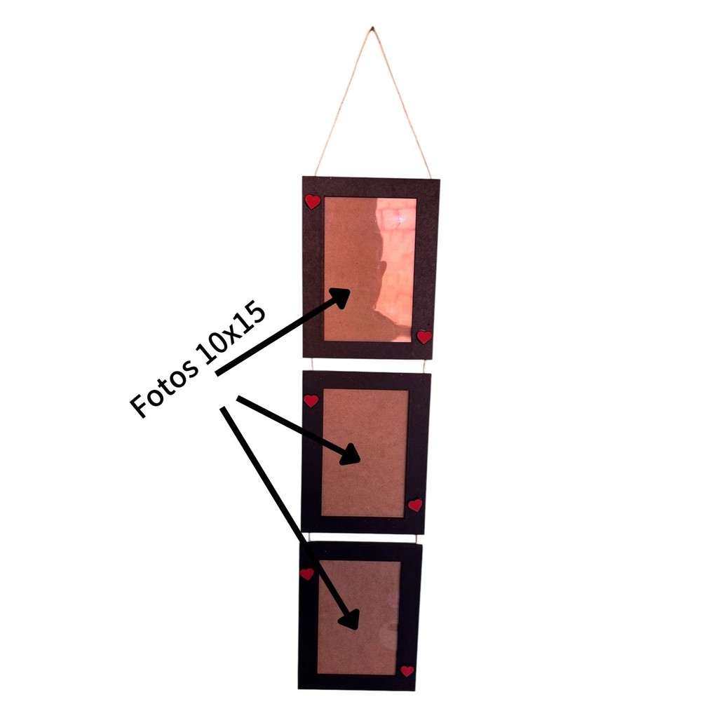 Porta-Retrato Triplo para Fotos 10x15 cm - Preto com Detalhes de Coração Transforme suas memórias em uma linda decoração com este charmoso porta-retrato triplo vertical! Feito em MDF de alta qualidade, ele comporta 3 fotos no tamanho 10x15 cm e já vai pronto para pendurar com uma cordinha de sisal resistente. Cada moldura possui um acabamento elegante em preto, com dois delicados corações vermelhos que adicionam um toque romântico e carinhoso à peça. Ideal para decorar quartos, salas ou até mesmo presentear alguém especial. ✅ Feito em MDF ✅ Acompanha acetato para proteger suas fotos ✅ Já vai com cordinha para pendurar ✅ Espaço para 3 fotos 10x15 cm ✅ Detalhes em alto-relevo com corações vermelhos Deixe sua parede ainda mais especial com esse porta-retrato cheio de amor!