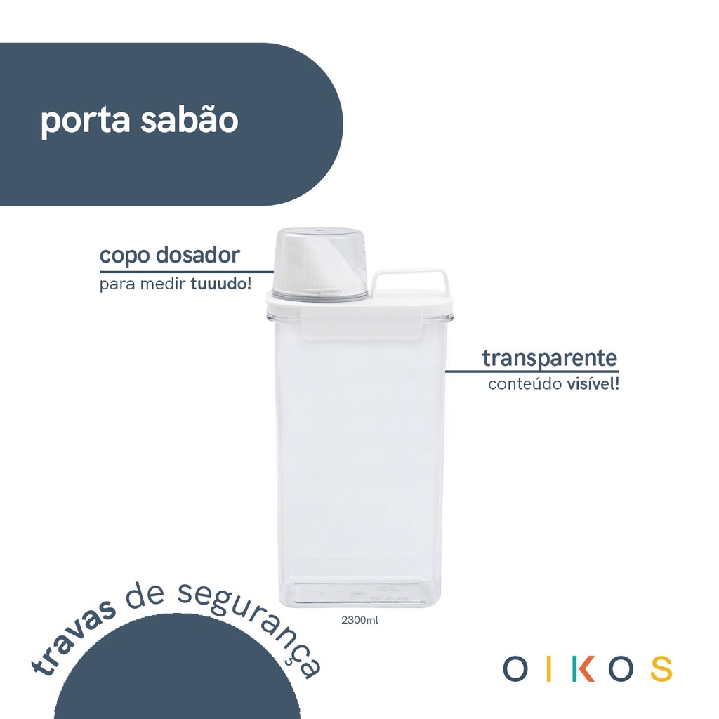 "conheça o porta sabão em pó com copo dosador e trava 2,3L da oikos! ideal para lavanderia, possui copo dosador para medir as quantidades exatas, tem alça para facilitar o transporte e travas para evitar vazamentos! armazene sabão em pó, líquido, amaciante, detergente e o que você quiser. dica para todos #oikolovers: ele é suuuper multiuso! você pode utilizar na cozinha para colocar e medir grãos, temperos, aveia, açúcar, café e outros alimentos. é de plástico e silicone. pode ser lavado na água corrente com esponja e sabão neutro. não pode ir na lava louças. leve praticidade e modernidade para sua casa! medidas: comprimento: 13cm | largura: 8cm | altura: 30cm"