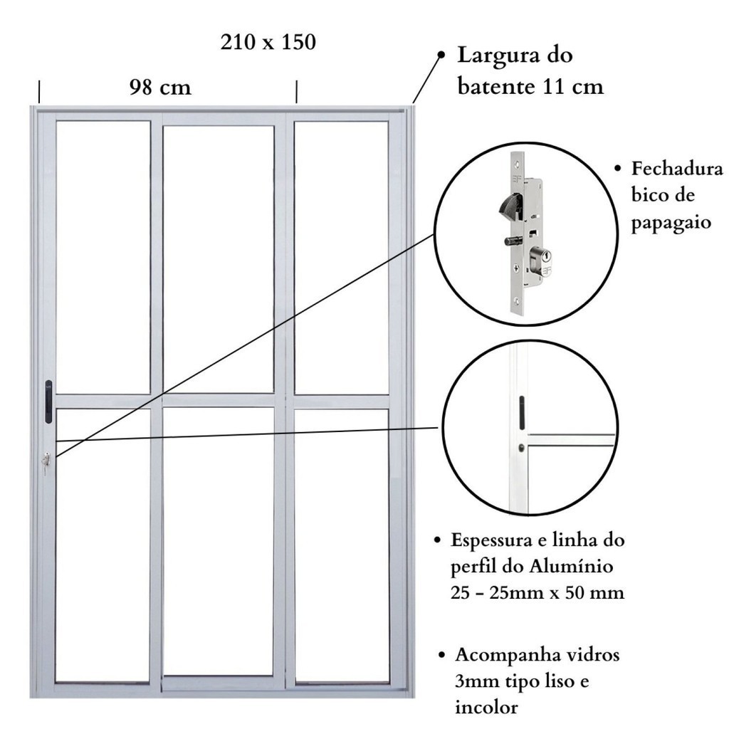 Porta Sacada de Alumínio 3 Folhas Sequenciais 210 X 150cm com Fechadura Linha 25 Branco