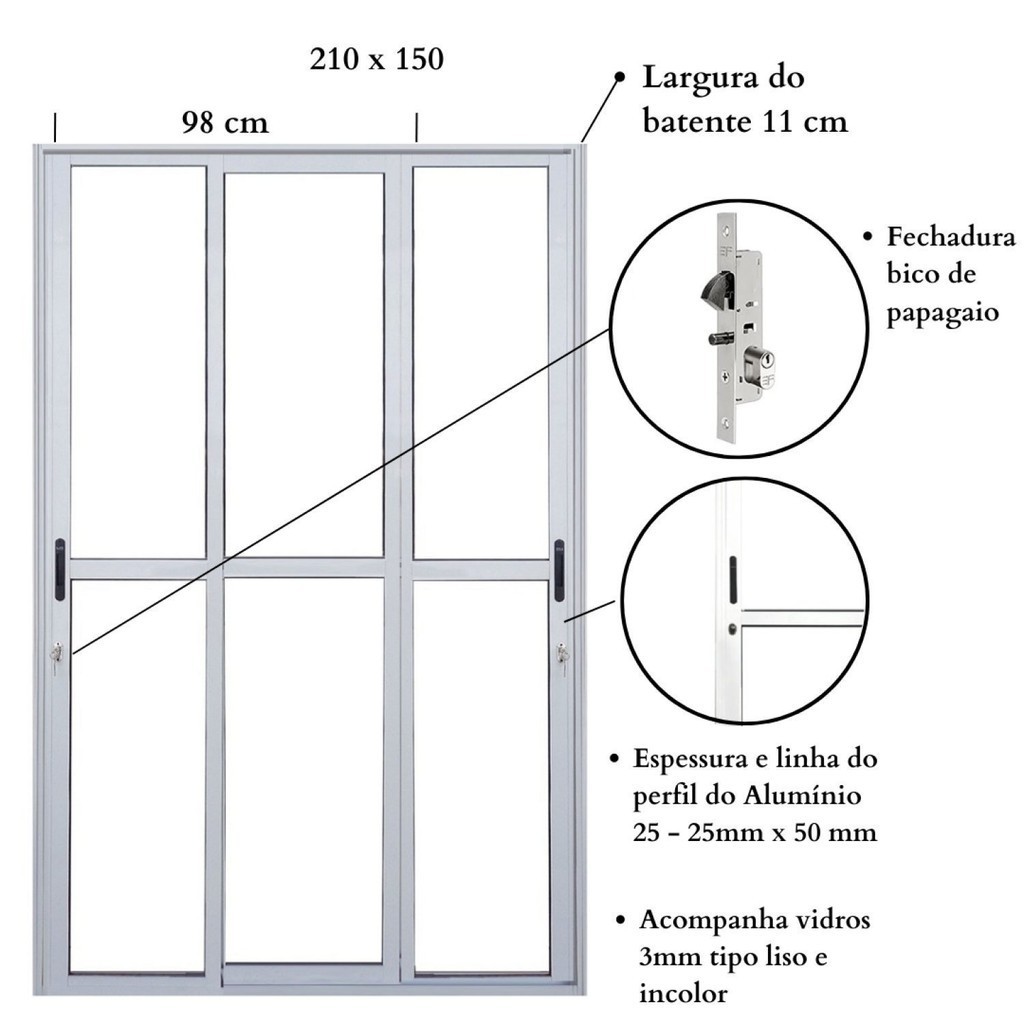 Porta Sacada 3 Folhas Sequenciais Móveis C/ Fechadura Linha 25 - Bergamo Você irá encontrar esta porta de correr de alumínio em 2 medidas: 210cm de altura, com as larguras de 120, 150, 180 e 200 cm. Uma excelente opção para quem busca uma porta de alumínio com grande durabilidade e resistência. Dicas de Instalação Ao adquirir uma porta de correr é importante notar que sua instalação deve-se respeitar o nivelamento, verifique o alinhamento das extremidades com uma ferramenta de nível para garantir a qualidade da instalação. Especificações Lado de Abertura: Ambos os Lados Largura do vão de passagem: 210 x 120 = 73 cm / 210 x 150 = 98 cm / 210 x 180 = 113 cm / 210 x 200 = 126 cm Espessura e linha do perfil do Alumínio 25 – 25mm x 50mm Peso (kg): 49 Elétrica: Não Garantia: 12 Meses Altura (cm): 210 Largura (cm): 150 Cor do Vidro: Incolor Espessura (cm): 11 Possui Grade: Não Tipo de Vidro: Liso Cor do Batente: Branco Acompanha Trinco: Não Desenho do Vidro: Transparente Escala de Brilho: Semi-Brilho Lado de Abertura: Dupla Textura da Porta: Com detalhe vidro Acompanha Batedor: Não Acompanha Batente: Sim Acompanha Puxador: Não Origem do Produto: Nacional Ambiente Principal: Sala de Estar Espessura do Vidro: 3 Largura do Batente: 11 Acompanha Dobradiça: Não Acompanha Fechadura: Sim Acompanha Guarnição: Não Material do Batente: Alumínio Possui Isolamento Acústico: Não Acompanha Manual de Instalação: Sim Dimensão da Maquina da Fechadura: 25 Material Principal Construção e Acabamento: Alumínio Marca: Esquadrias Bergamo Cor: Branco Cor do Produto: Branco Itens Inclusos: 1 Porta Cor Predominante: Branco Linha ou Coleção: Linha 25 Medida do Vão (A x L): 98 cm Tamanho do Produto: 210cm x 150cm