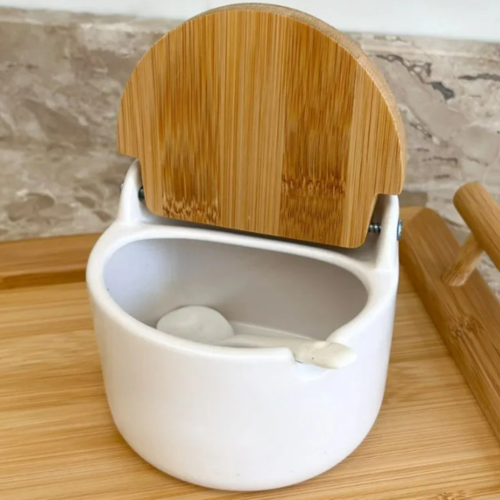Porta Sal Saleiro Mesa Em Porcelana Com Colher Tampa Madeira Lyor Porta Condimentos