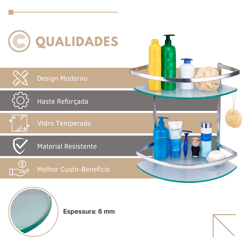 Porta Shampoo Banheiro Canto Duplo Vidro Box Nicho Cromado C. 3555