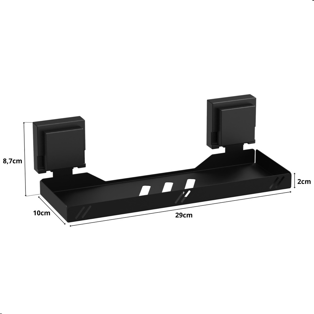ESPECIFICAÇÕES TÉCNICAS Material: Aço Carbono Material Ventosas: Plástico ABS Acabamento: Pintura Eletrostática Epóxi Cor: Preto Fosco Tratamento Antiferrugem INSTALAÇÃO Limpeza da Superfície: Certifique-se de que a superfície onde você deseja fixar a ventosa esteja limpa e livre de poeira, graxa ou qualquer substância que possa interferir na aderência. Umidade: Molhe levemente a ventosa. Isso cria um selo temporário com a superfície e ajuda na aderência. Pressão Firme: Pressione a ventosa contra a superfície desejada e gire para a direita até travar. MEDIDAS Altura: 8,5cm Largura: 29cm Profundidade: 10cm ITENS INCLUSOS 1 Porta Shampoo 2 Ventosas IMPORTANTE Evite fixar a ventosa em superfícies porosas ou irregulares, pois isso pode comprometer a aderência. Além disso, é importante seguir as instruções específicas fornecidas pelo fabricante do porta toalha para garantir a fixação correta e durabilidade ao longo do tempo. Remover regularmente a cada 3 meses e reaplicar conforme instruções de montagem. Não use chaves, facas e objetos pontiagudos para retirar o produto da superfície.