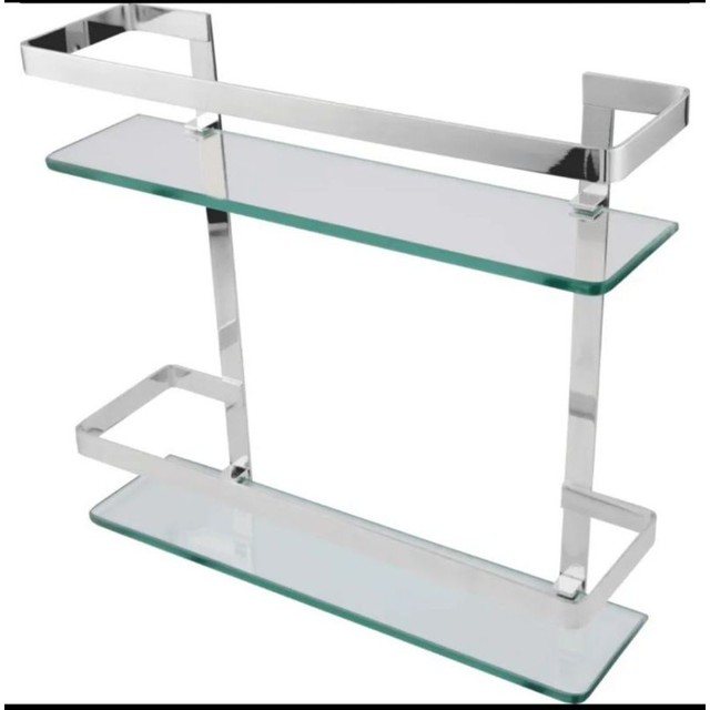 Produto em alumínio polido vidros 06mm 04 fixação Porta Shampoo Duplo de Vidro 6mm- Modelo Reto Com Grade Cromada e vidro na cor cristal (transparente) de 6mm. Material: -Feita em metal alumínio, afinado e polido -Acompanha bucha e parafuso para fixação -Espessura do vidro: 6mm -Comprimento: 30cm -Largura:10cm -Distância entre as base: 30cm -Altura da grade: 6cm. -Altura total: 36cm