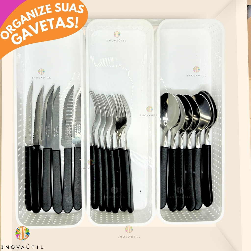 Porta Talher Organizador de Gaveta 3Pçs 30x10x06 Branco Rattan Cozinha Cosméticos