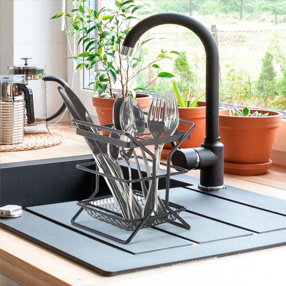 Porta Talheres Cozinha Escorredor de Bancada Aramado com Divisorias Luxo Preto Arthi-2509
