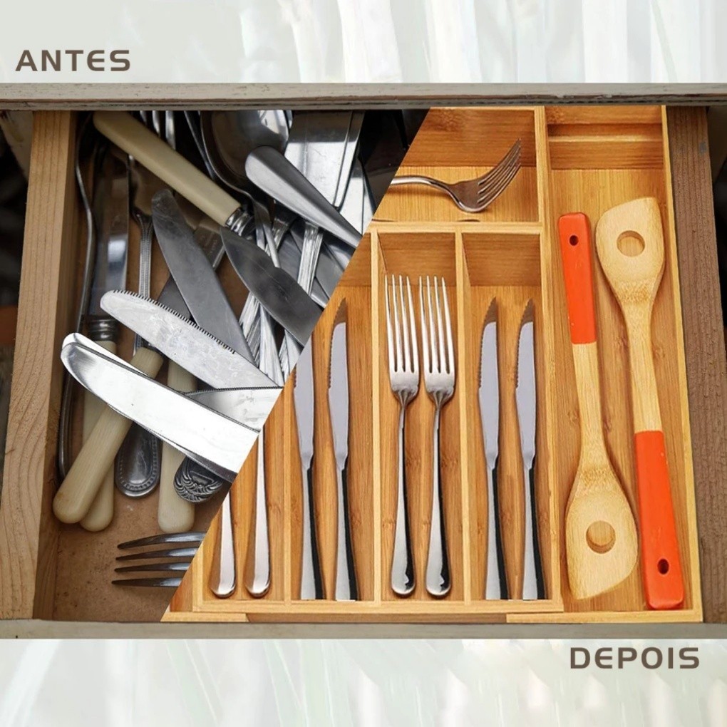 Porta Talheres de Bambu Extensível Organizador de Gavetas com 7 Divisórias Grande Divisor de Cozinha Multiuso