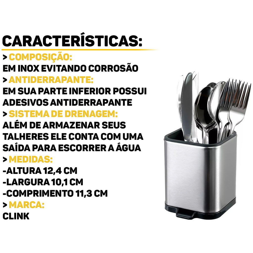 Porta Talheres Aço Inox E Plástico Clink Ideal para organizar seus utensílios de forma prática. Com um compartimento espaçoso, se encaixa perfeitamente em qualquer espaço de sua cozinha, além de ser durável e resistente. Seu design retangular adiciona um toque de sofisticação ao ambiente. Características: > Durável e resistente; > Fácil limpeza e manutenção; > Organização e praticidade na cozinha; > Design moderno e elegante para combinar com qualquer decoração. Especificações Técnicas: > Material: aço inox e plástico; > Dimensões do produto (C x L x A): 10cm x 11cm x 12,5cm. - Marca: Clink - Garantia: 90 dias contra defeitos de fabricação Vantagens de comprar na Brester: - Produto a pronta entrega. - Produto novo, com garantia de fábrica. - Nota fiscal para Pessoa Física e Pessoa Jurídica.