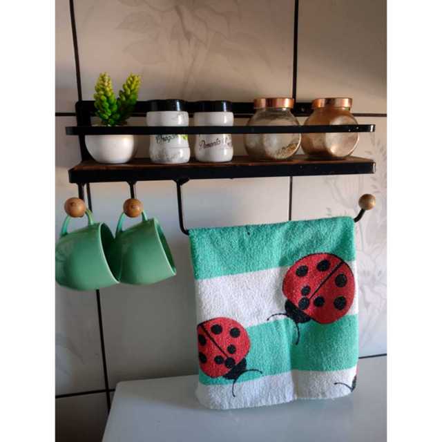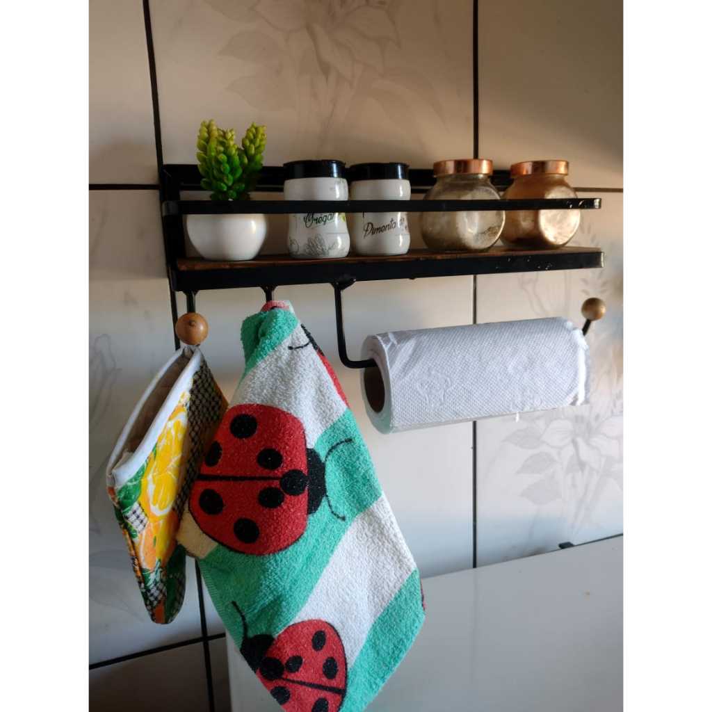 Prateleira de parede 1 andar com 2 ganchos e porta papel toalha perfeita para organizar e decorar sua cozinha ou área gourmet, cantinho do churrasco Tem uma ótima construção em madeira com cera e selador e aço com pintura eletrostática, que evita que a prateleira enferruje com o tempo ou estrague mais rápido. DIMENSÕES DO PRODUTO: Comprimeto: 41cm Largura: 10cm Altura: 20,5cm - Pintura eletrostática (não enferruja). - Madeira possui selador e cera, para melhor conservação do produto. AMBIENTES POSSÍVEIS PARA USO: - Área Gourmet - Cozinhas - Fazendas - Chácaras - Bares - Lanchonetes - Restaurantes -jardins OBS: os itens presentes na fotos não acompanham o produto. Produto artesanal portando as medidas podem sofrer pequenas alterações. Enviamos em uma embalagem segura para que seu produto chegue em perfeitas condições. ENVIO IMEDIATO; TEMOS TODOS OS PRODUTOS A PRONTA ENTREGA. Produtos de qualidade e fabricação própria. Tok Final Artesanatos com melhores produtos para sua decoração em modelos rústico moderno e sofisticado!
