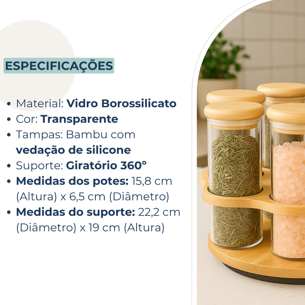 SOBRE O PRODUTO Organize seus temperos com praticidade e elegância! Conjunto com 6 potes em vidro borossilicato resistente, com 320ml cada. Acompanha tampas de bambu e suporte giratório em bambu natural, que permite acesso rápido e prático aos frascos através de rotação suave em 360°. Ideal para facilitar o acesso e manter sua cozinha organizada. - Ideal para temperos, ervas, sal, grãos e especiarias - Design moderno com toque natural - Produto durável, funcional e decorativo CUIDADOS - Lave-o a mão com água morna e sabão neutro - Não mergulhe o pote e a tampa na água por longos períodos - Ao limpar, use um pano macio ou espeja não abrasiva para evitar arranhar a superfície - Após a lavagem, seque o pote e a tampa completamente com um pano seco - Matenha o suporte em um lugar seco e arejado ESPECIFICAÇÕES TÉCNICAS Material dos potes: Vidro borossilicato Tampas: Bambu com vedação segura Capacidade de cada pote: 320ml Medidas dos potes: 15,8 cm (Altura) x 6,5 cm (Diâmetro) Medidas do suporte: 22,2 cm (Diâmetro) x 19 cm (Altura) Suporte giratório 360°