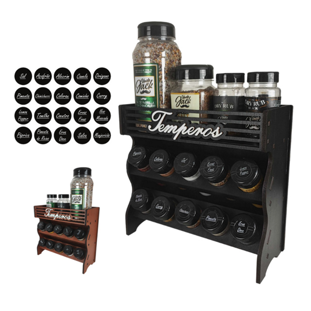 Porta Tempero Mesa ou Parede com Potes com Local Para Colocar Potes de Sal e Cartela de Etiquetas