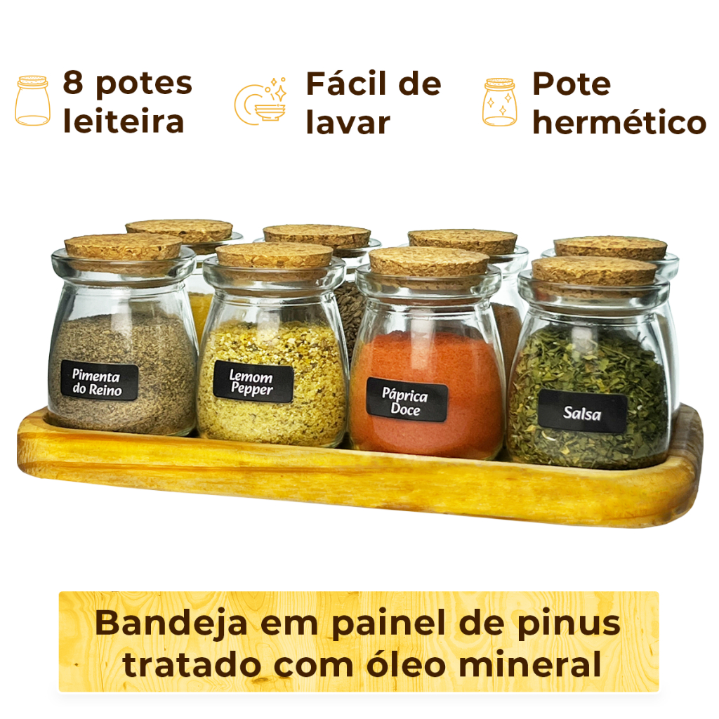 PORTA TEMPERO ÁGORA COM 8 POTES DE VIDRO COM ROLHA E BANDEJA + CARTELA DE ADESIVOS Potes de design bonito e funcional, com capacidade de 110ml, e tampa de rolha, que veda o pote perfeitamente. A Bandeja é confeccionada em Painel de Pinus e tratada com óleo mineral. Material possui toque suave e fácil limpeza. >> ITENS INCLUSOS: - 8 Potes de Vidro de 110ml com tampa de rolha - 1 Bandeja de Madeira Pinus 13x30cm - 1 Cartela com 24 nomes de temperos Agora ficou ainda mais fácil manter sua cozinha organizada! A cartela com 24 adesivos de temperos permite identificar cada pote, deixando tudo mais prático e bonito. Ideal para quem busca funcionalidade sem abrir mão do estilo na cozinha. >> PERGUNTAS FREQUENTES 1- COMO É FEITO O ENVIO? Todos os pedidos são embalados cuidadosamente para evitar danos no transporte, e são entregues rapidamente pela Shopee. Quando o pedido é feito, separamos imediatamente e enviamos no mesmo dia! 2- COMO HIGIENIZAR? Higienização convencional, recomenda-se não deixar a bandeja em contato com água por longos períodos. 3- TEM GARANTIA? Sim, 30 dias de Garantia! Você pode devolver seu pedido caso haja qualquer problema ou desistir da compra, e será reembolsado em 100%. 4- É POSSÍVEL TROCAR OS NOME DOS ADESIVOS? Não, os adesivos são padronizados. Caso sinta falta de algum tempero, deixe-nos uma sugestão nas mensagens. Se ainda tiver dúvidas, envie-nos na seção abaixo que a nossa equipe estará pronta para te responder durante todos os dias da semana. Equipe Pratelar