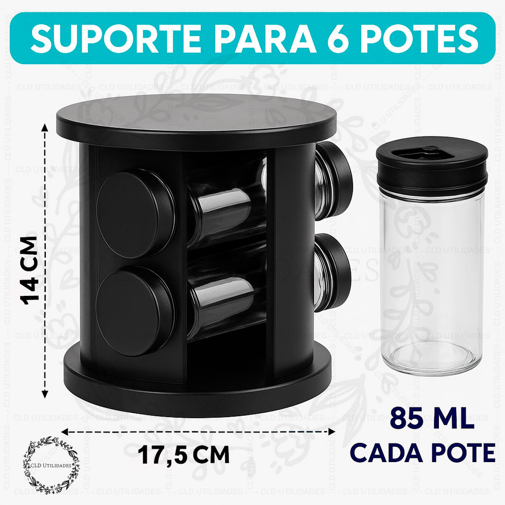 Porta Condimentos Giratório 360°. 🧂 Organização com estilo e praticidade na sua cozinha! 🧂✨ Deixe seus temperos favoritos sempre à mão com o Porta Temperos Giratório com 6 Potes de Vidro. Com design moderno na cor preta, ele gira suavemente, facilitando o acesso rápido e prático aos condimentos enquanto você cozinha. Os potes são de vidro resistente com tampas rosqueáveis e acabamento refinado, ideal para manter sua bancada organizada e bonita! 🌟 Benefícios do Produto: ✅ Organizador giratório compacto e elegante ✅ 6 potes de vidro com excelente vedação ✅ Visual moderno que combina com qualquer cozinha ✅ Facilita o acesso aos temperos durante o preparo das refeições ✅ Ideal para temperos, ervas, especiarias e condimentos em geral 📐 Especificações Técnicas: Capacidade de cada Pote: 85ml Material: Base plástica (giratória) + potes de vidro Cor: Preto Quantidade: 6 potes inclusos Tampa com vedação segura Ideal para uso doméstico ou profissional 🍽️ Cozinhe com mais praticidade e organização! Adquira agora seu Porta-Temperos Giratório e leve mais estilo e funcionalidade para sua cozinha! Estoque limitado! 🔥