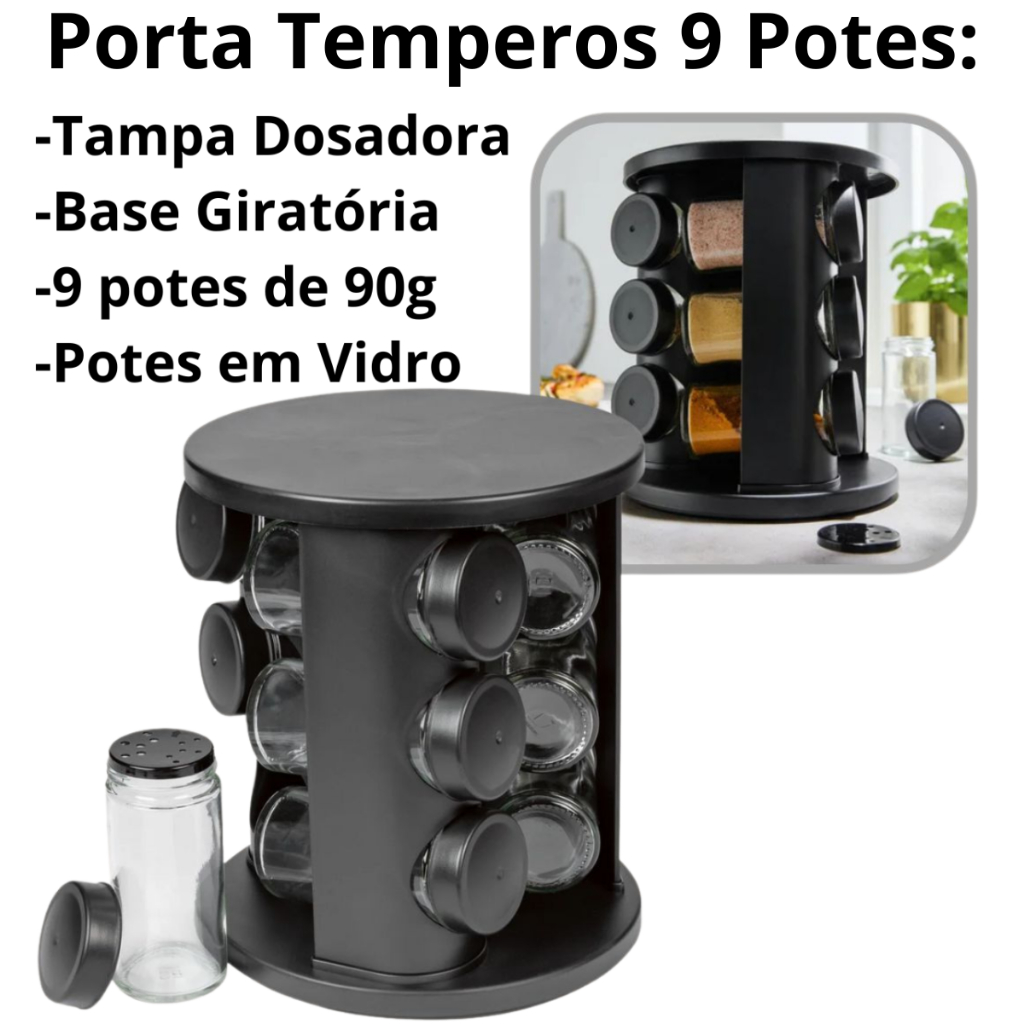 Porta Temperos Condimentos Giratório 6, 9, 12 Potes Vidro 90G com Tampa Dosadora Preto Cozinha