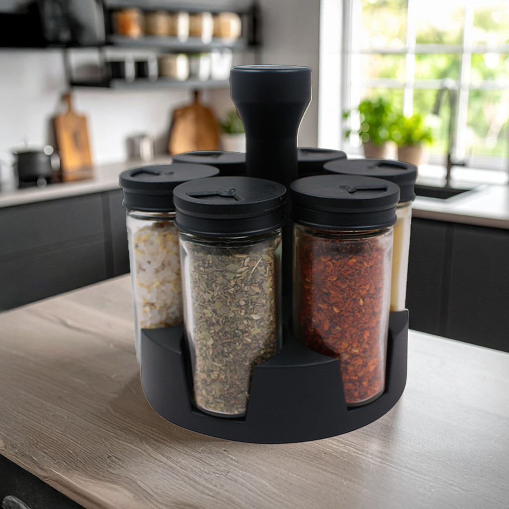 Porta Temperos Condimentos Giratório 6 e 9 Potes Vidro 90G com Tampa Dosadora Preto + Etiquetas Adesivas