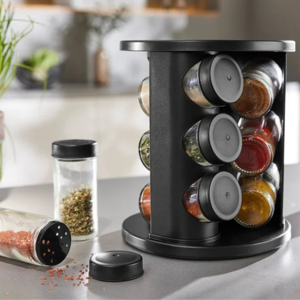 Porta Temperos Condimentos Giratório 9 Potes Vidro 90G com Tampa Dosadora Preto + Etiquetas Adesivas