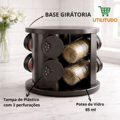 | Porta Temperos Giratório Com 6 Potes de Vidro 85ml Design Moderno este produto | R$ 32,50 | 55% | 4.9/5 | — |