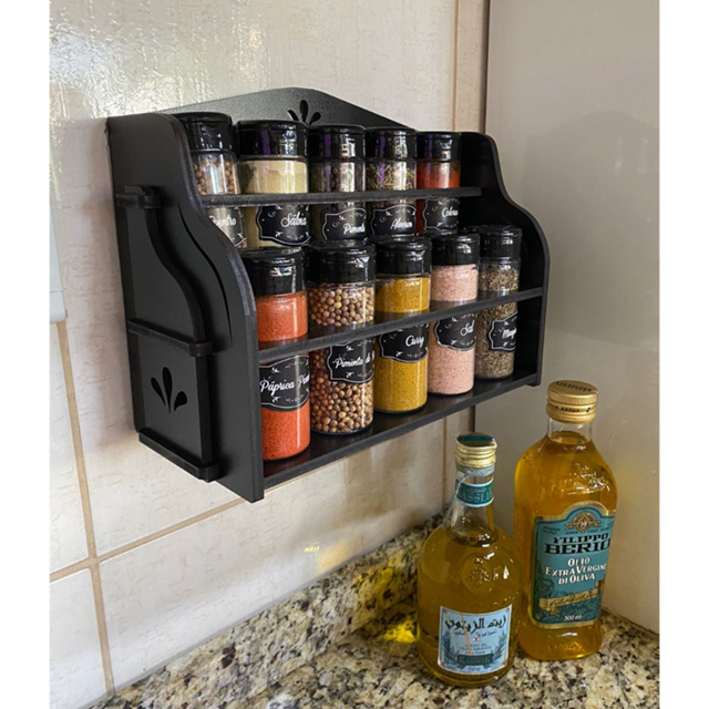 ### ENVIAMOS 16 ETIQUETAS JÁ COM OS NOMES DE DIVERSOS TEMPEROS **** PRODUTO A PRONTA ENTREGA. - 10 Potes de plástico com capacidade de 100ml. - Tampa dosadora plástica flip top, possui duas aberturas, com furinhos e do outro lado com abertura total para temperos maiores e o melhor a tampa não enferruja. *** Pode ser usado em mesa, balcão ou fixado na parede. Medidas do pote. - Capacidade: 100ml - Altura: 10 cm - Diâmetro: 4 cm DIMENSÕES DO PRODUTO: - Altura: 20 cm - Largura: 28 cm - Profundidade 12 cm CONTEÚDO DA EMBALAGEM: - 01 Porta temperos em madeira (mdf) com 10 potes de plástico 100 ml. - 10 tampas flip top de plástico com duas aberturas. - 16 etiquetas adesivas com o nomes de temperos já impressos, não fazemos alteração dos nomes. - NÃO ACOMPANHAM TEMPEROS. ************************* Bella Art in madeira************************* Há 14 anos vem inovando o mercado, com grandes novidades deixando sua casa moderna e aconchegante, proporcionando maior harmonia com o ambiente desenvolvendo peças que combinam com diversos tipos de decoração e acrescentam estilo a qualquer ambiente da sua casa.