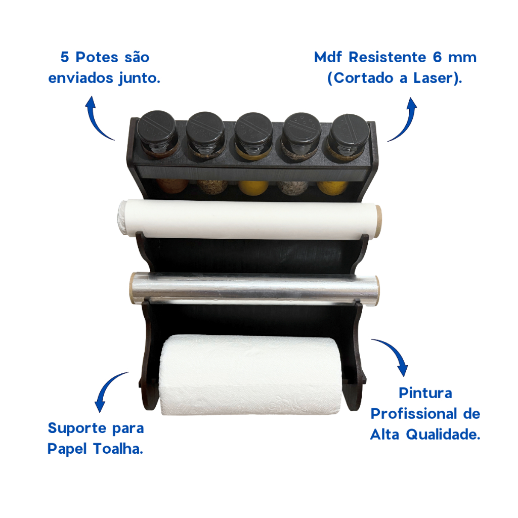Porta Temperos Parede com 5 Potes e Porta Papel Alumínio, Papel Toalha e Papel Manteiga.