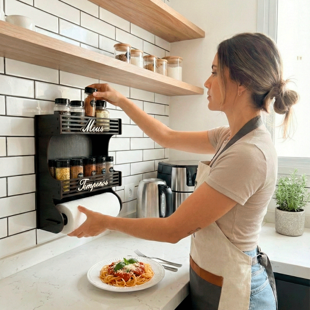 Porta Temperos Parede com Porta Papel Toalha e Local Para Colocar Potes.