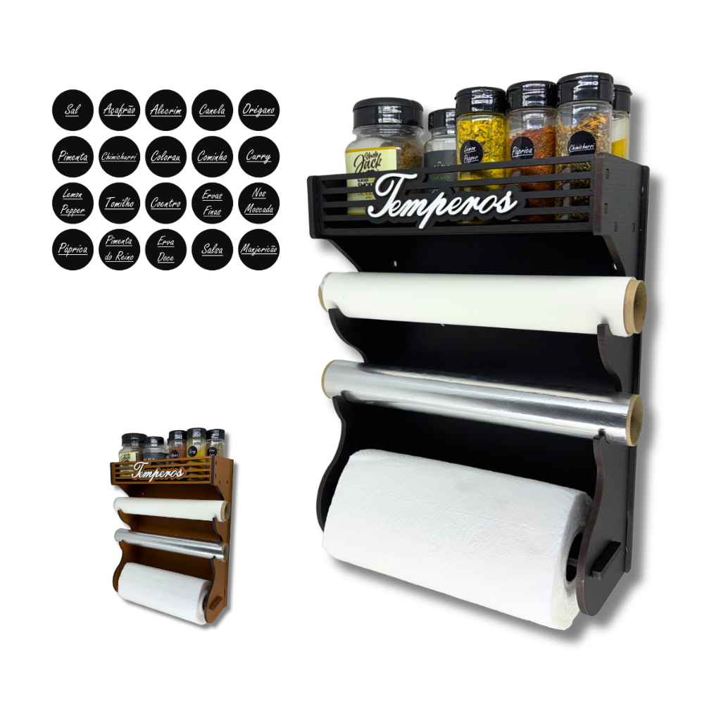 Porta Temperos Parede com Porta Potes e Porta Papel Alumínio, Papel Toalha e Papel Manteiga.