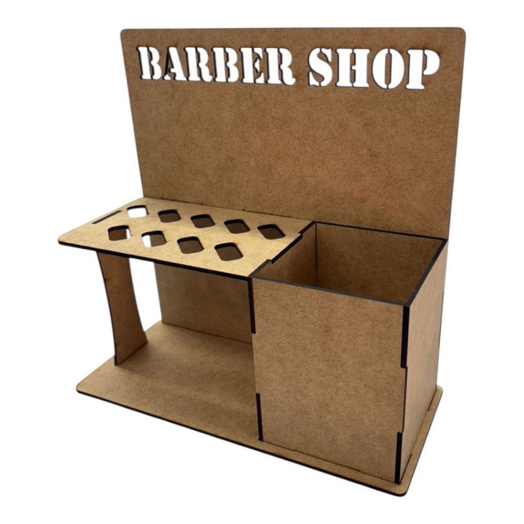 Porta Tesouras de Bancada para Barbearia - Produzido em MDF de Reflorestamento - Vão Para 9 Tesouras - Caixa Para Pentes, Maquinas, Escovas - Tamanho 22 x 22 x 9cm (A x L x P) - Escrita Vazada BARBER SHOP - Produzido a Laser - Pintura Industrial Preto Fosco - Ja vai Montado - ESCOLHER NO MOMENTO DA COMPRA A COR DO PRODUTO ( PRETO ou CRU ) CRU VOCÊ PODE PINTAR OU PERSONALIZAR DA FORMA QUE DESEJAR