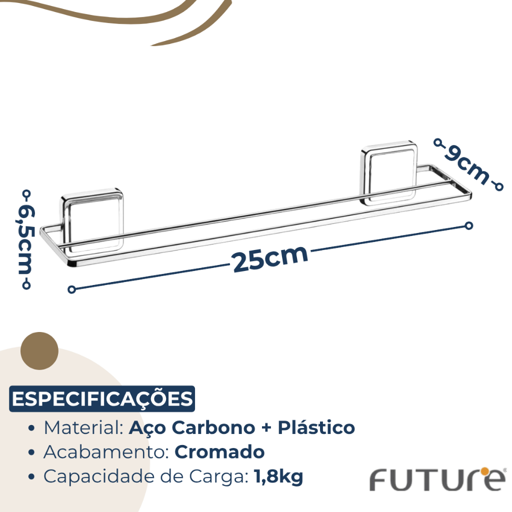 SOBRE O PRODUTO Com duas toalhas no mesmo Toalheiro, você economiza espaço e organiza o banheiro. Nele você pode utilizar toalhas de banho ou de rosto. Além do tradicional tratamento superficial da Future - onde são aplicadas até 4 camadas de metal - os produtos são revestidos com uma camada extra do protetivo especial Rust Free, garantindo cores vivas e brilhantes, além de maior resistência contra ferrugem. Itens inclusos: 1 Toalheiro Duplo 45cm com Adesivo 3M RECOMENDAÇÕES Superfícies recomendadas: Cerâmica, porcelanato, mármore, granito, metal liso, vidro, concreto liso, madeira. Não recomendado (pode ser utilizado com parafuso): Paredes pintadas ou com papel de parede (pode danificar a superfície caso necessária a remoção do adesivo). Superfícies irregulares, ásperas, brutas ou com textura grossa. MEDIDAS - Profundidade: 9cm - Lagura: 45cm - Altura: 6,5cm - Peso: 0,324kg ESPECIFICAÇÕES - Máteria Prima: Aço Carbono / Plástico - Cor/Acabamento: Cromado - Capacidade: 1,8kg