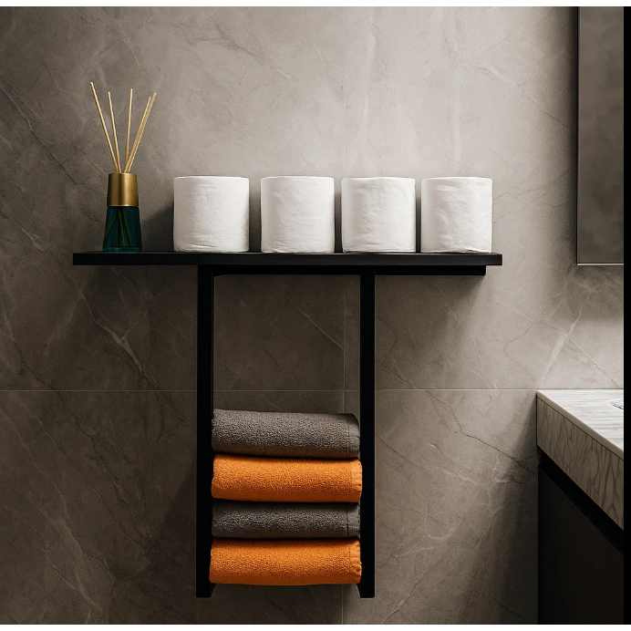 Porta Toalha Industrial Suspenso com Prateleira Resistente em MDF Preto