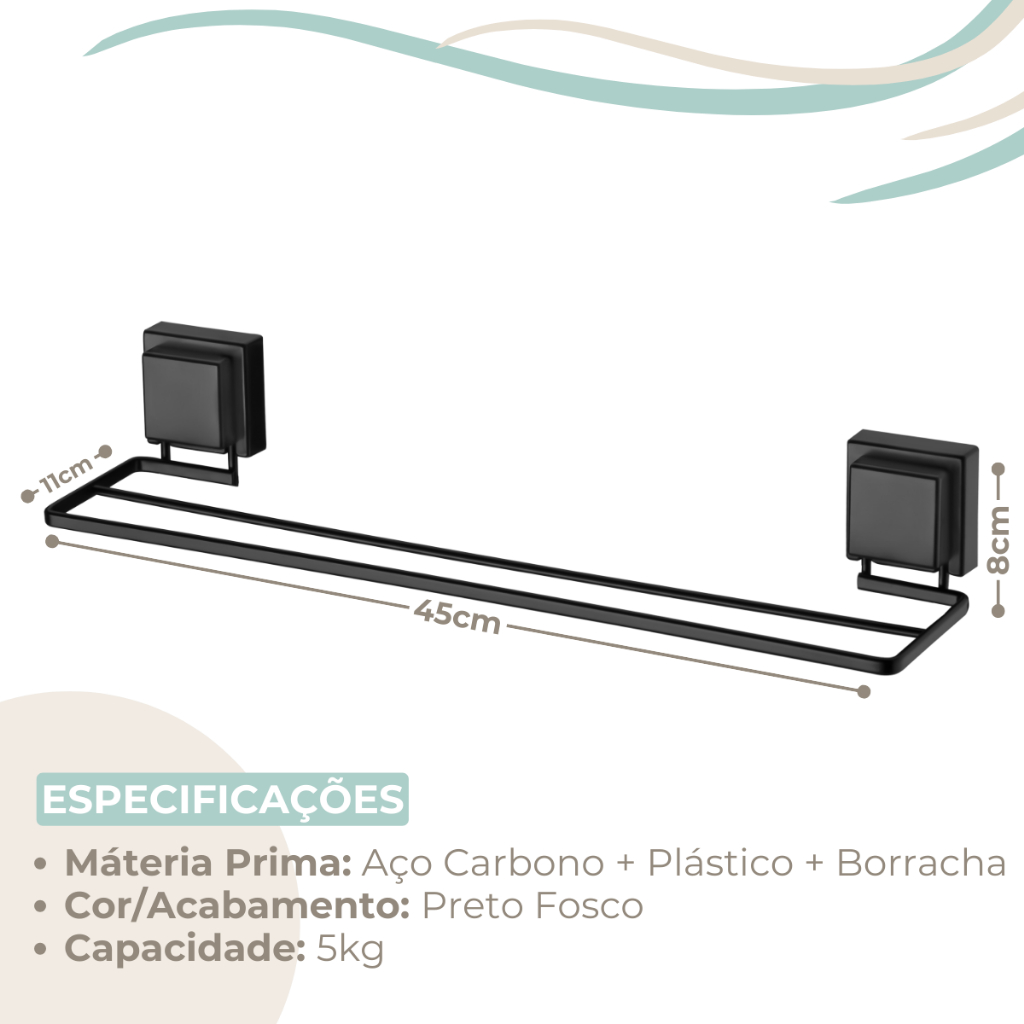 Porta Toalhas Duplo Toalheiro Parede Box 45cm Preto Fosco Ventosa Sem Furo