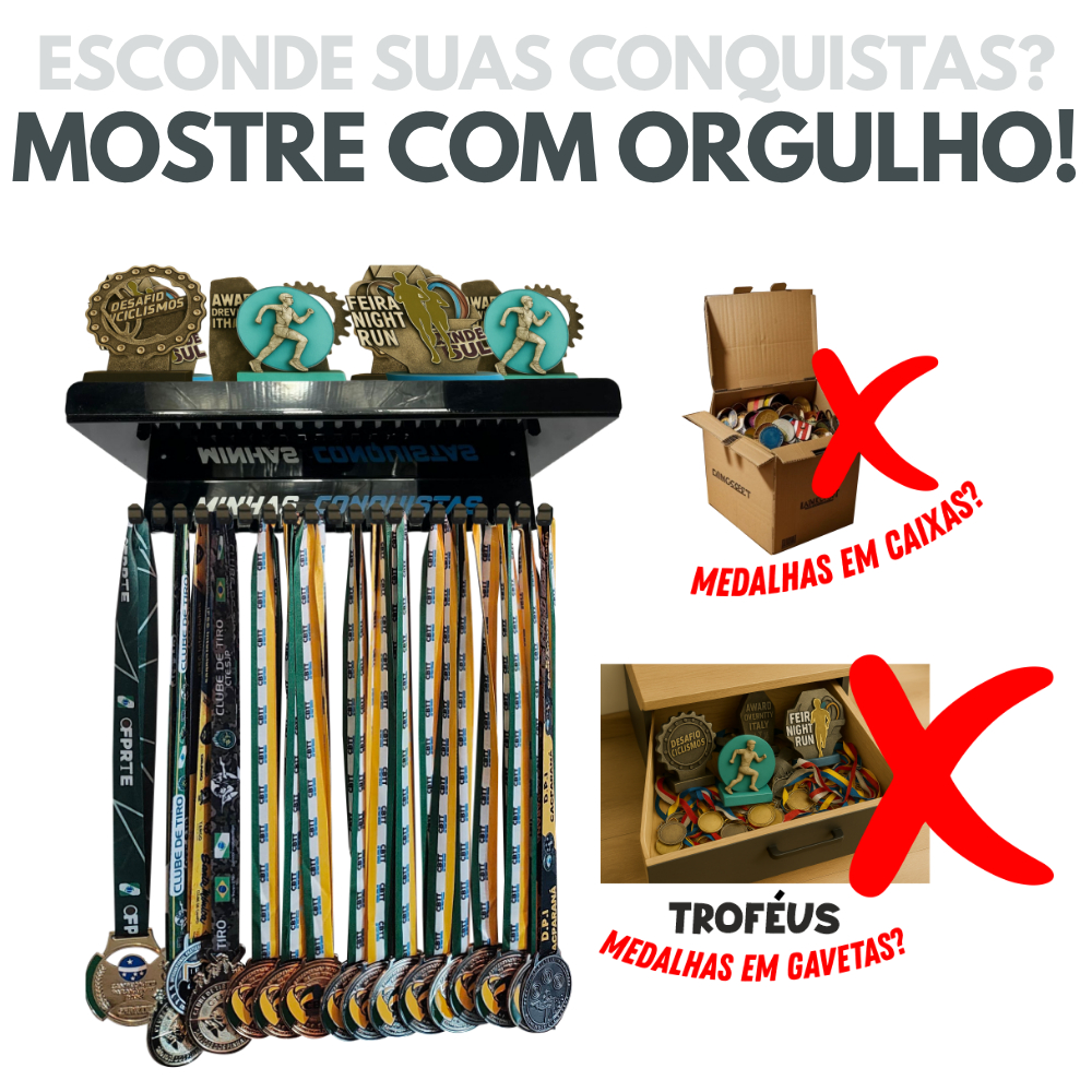 QUADRO DE MEDALHA – uma loja onde suas conquistas brilham e revelam que você é único. A Quadro de Medalha traz o que há de mais moderno, atual e inovador no mundo esportivo, especialmente para atletas esforçados e merecedores como você. Nossa prioridade é garantir a qualidade, resistência e um acabamento impecável em todos os nossos produtos. Nosso objetivo não é apenas atender às suas necessidades, mas superar suas expectativas. Os porta-medalhas da Quadro de Medalha são projetados para atletas dedicados que desafiam seus limites diariamente. Feitos com madeira ecológica e suportes de ferro maciço, garantem máxima durabilidade e excelência. Oferecemos uma ampla variedade para diferentes modalidades esportivas, garantindo que cada conquista tenha o destaque que merece. Nossos porta-medalhas são criados para exibir com orgulho cada conquista, refletindo o esforço e a dedicação de nossos clientes em cada vitória pessoal. IDEAL PARA PRESENTEAR PRONTA ENTREGA. ENTREGAMOS PARA TODO O BRASIL. DIRETO DA FÁBRICA. FOTOS REAIS.ACABAMENTO PREMIUM. Frase MINHAS CONQUISTAS. NÃO HÁ POSSIBILIDADE DE PERSONALIZAÇÃO. SHOPEE NÃO PERMITE Para a capacidade MÁXIMA do porta medalhas (em torno de 80 medalhas) devem ser colocadas mais de uma medalha por suporte!!! Frase padrão do Porta Medalhas é MINHAS CONQUISTAS cortado na madeira. CARACTERÍSTICAS MEDIDAS: 38 centímetros de comprimento total 9 centímetros de altura total Prateleira 19,5cm de largura Feito de acrílico puro cast Acabamento preto brilhante Possui 20 suportes de acrílico que aguentam o peso das medalhas. Se colocar 4 medalhas em cada suporte, cabem por volta de 80 medalhas. PERGUNTAS FREQUENTES 1- De qual material é feito o porta-medalhas? Resposta: O porta-medalhas é feito de acrílico com um acabamento preto brilhante. Os suportes, onde as medalhas são penduradas, são de acrílico proporcionando grande resistência para suportar o peso das medalhas. 2- O porta-medalhas realmente comporta até 80 medalhas? Resposta: O porta-medalhas possui 20 suportes e, como são feitos de acrílico puro, você pode pendurar mais de uma medalha por suporte sem comprometer a estrutura. Para atingir a capacidade máxima anunciada, será necessário pendurar mais de uma medalha em cada suporte. 3- Como é fixado o porta-medalhas na parede? Resposta: Recomendamos a utilização de parafusos e buchas, devido ao peso acumulado das medalhas. Não aconselhamos o uso de fita dupla face, não porque ela não suportaria o peso, mas devido à possível condição da parede. Por exemplo, se a parede tiver várias camadas de tinta, a fita pode acabar desprendendo a tinta, o que faria o porta-medalhas cair, podendo danificar tanto o suporte quanto as medalhas. - Tem os produtos a pronta entrega? E quanto tempo o produto será enviado? Resposta: Sim, temos todos os modelos a PRONTA ENTREGA para envio IMEDIATO. Se a compra for paga via boleto, pode demorar até 3 dias úteis para esse boleto compensar no banco e só depois desse prazo, a etiqueta de envio será liberada para fazermos a postagem. 5- O PORTA MEDALHAS é resistente? Resposta: É GARANTIDO. Totalmente resistente, acabamento excelente, material muito bom. Qualidade TOP. 6- Qual o prazo de entrega na minha casa e onde posso rastrear o pedido? Resposta: As entregas são realizadas pelos Correios ou transportadoras parceiras. Nossa loja se compromete a despachar o produto o mais rápido possível, conforme as informações disponíveis no site. No entanto, eventuais atrasos podem ocorrer e, nesses casos, esclarecemos que a responsabilidade é dos Correios ou transportadora, e não da loja. Você poderá acompanhar o rastreamento diretamente na página da sua compra, acessando o site. Caso tenha mais dúvidas, estamos à disposição! LEIA ATÉ O FINAL Cada medalha conquistada representa a sua superação pessoal, mostrando que cada minuto de treino, cada gota de suor, realmente valeu a pena. Agora, será que é justo deixar essas conquistas guardadas em uma caixa ou gaveta? Será que você não deveria exibir o valor e o significado que cada uma dessas medalhas tem para você? As pessoas ao seu redor merecem saber o quanto você se dedica e como isso está transformando sua vida para melhor! E quem sabe, você ainda pode inspirar seus amigos e familiares a seguirem o mesmo caminho. por isso que estamos aqui! Para oferecer um espaço organizado e atraente, onde suas conquistas e medalhas possam ser exibidas com orgulho para todos verem. Aproveite e transforme suas conquistas em inspiração para todos ao seu redor! Agradecemos a sua visita à Quadro de Medalha.