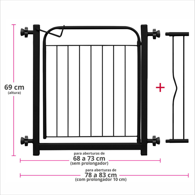 Tenha mais tranquilidade em sua rotina de casa ou trabalho (home office). Limite a passagem em portas, corredores e vãos com este portão prático, bonito e seguro. Ele vai deixar seu bebê e seus pet livres de situações de risco! Tamanho: Sem Prolongador (AxLxP): 69x70x4 cm Cores: Branco e Preto Possui trava click! Não é necessário furar o batente da porta para sua instalação pois conta com manípulos de pressão. Para vãos de 68 a 73 cm e 78 a 83 cm. Para aberturas de 68 a 73 cm (sem prolongador) e 78 a 83 cm c/ prolongador Excelente opção para segurança do seu pet. É indicado para cachorros, porém também pode ser usado para crianças.