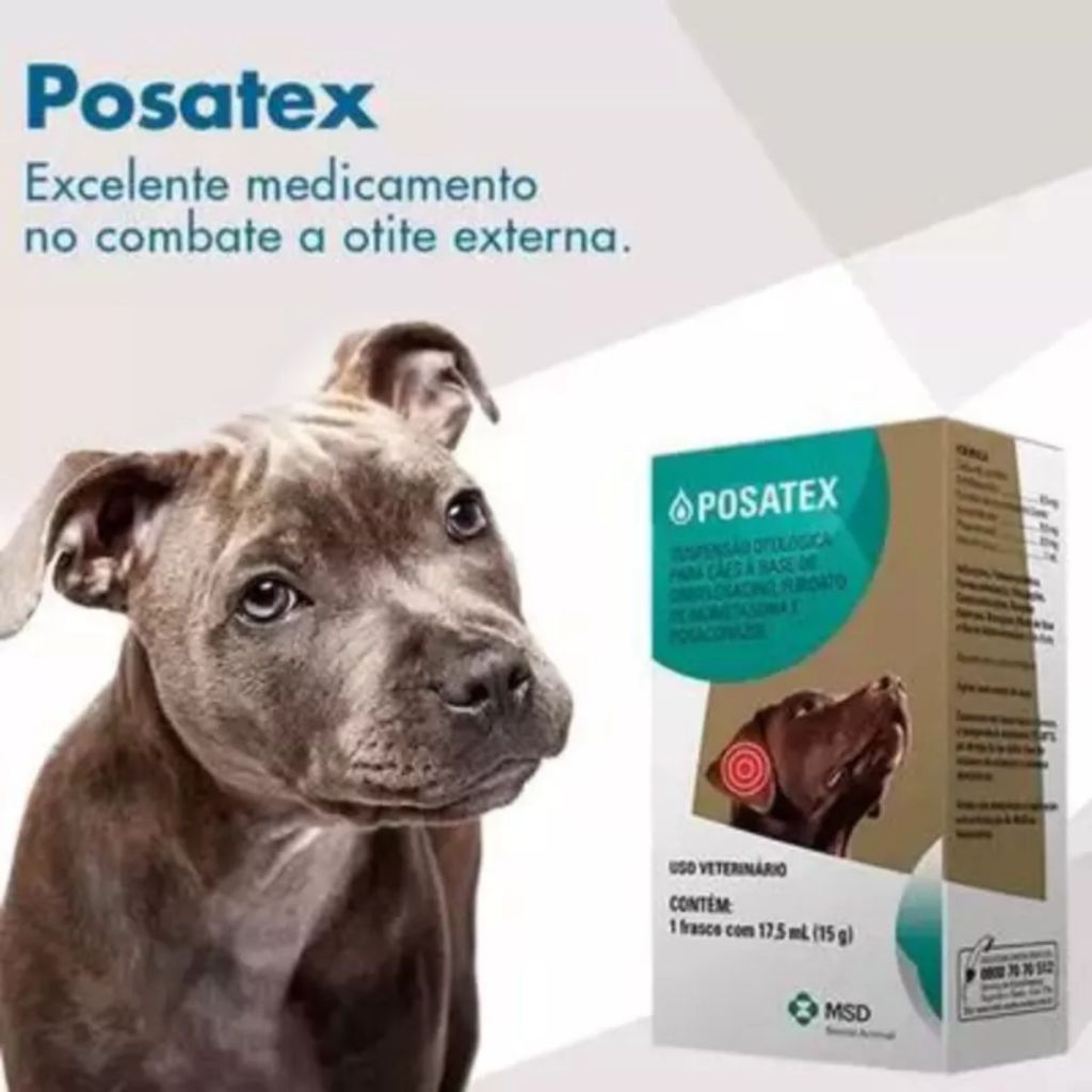 A MANADA ANIMAL é um marketplace de produtos veterinários. É a escolha certa para tutores que prezam pela qualidade dos produtos que seu animal necessita. Tudo com o suporte de uma equipe de veterinários e gestores com mais de 10 anos de experiência no mercado. Fique tranquilo, todos os nossos produtos são originais, adquiridos através de distribuidores credenciados! Ah, e todas as vendas acompanham nota fiscal! MANADA ANIMAL, Tranquilidade pra você, cuidado para ele! _________________________________ Posatex Remédio Para Otite Anti-inflamatório 17,5ml OriginalInvista na qualidade do Posatex Remédio para Otite em Cachorros Anti-Inflamatório 15,5ml MSD para oferecer tratamentos eficazes contra a otite em Cachorros.FÓRMULACada mL contem:Orbifloxacino ............................................................. 8,5 mgFuroato de mometasona (como monohidrato) ............ 0,9 mgPosaconazol ............................................................... 0,9 mgVeiculo q.s.p ................................................................. 1 mLIndicação: Tratamento de otites externas agudas e nas exacerbações agudas de otite externa recorrente, associadas as bactérias sensíveis ao Orbifloxacino tais como Staphylococci coagulase positivo, Streptococci beta-hemolítico, Pseudomonasaeruginosa, Proteus mirabilis, Corynebacterium spp, e Enterococcus faecalis e fungos sensíveis ao posaconazol, em particular, a Malassezia pachydermatis.DOSAGEM, MODO DE USAR E VIA DE ADMINISTRAÇÃOAdministração auricular.Uma gota contem 244 ?g de Orbifloxacino, 24 ?g de Furoato de mometasona e 24 ?g de Posaconazol.O canal do ouvido externo deve ser meticulosamente limpo e seco antes do tratamento. Pelos em excesso na área de tratamento devem ser cortados.Agitar bem antes de usar.Cães com peso inferior a 2 Kg, aplicar 2 gotas no ouvido uma vez ao dia.Cães com peso entre 2-15 Kg, aplicar 4 gotas no ouvido uma vez ao dia.Cães com peso de 15 Kg ou superior, aplicar 8 gotas no ouvido uma vez ao dia.Utilize-o em temperatura ambiente (não introduza material resfriado no ouvido).O tratamento deve continuar durante 7 dias consecutivos.Após aplicação, a base do ouvido pode ser suavemente massageada de forma rápida para permitir que a preparação penetre na parte inferior do canal auditivo.PRECAUÇÕES· A otite de origem bacteriana ou fúngica e por vezes secundaria. A causa primaria deve ser identificada e tratada;· A utilização do produto deve basear-se em testes de susceptibilidade de isolados bacterianos e/ou outros testes diagnósticos apropriados;· Os medicamentos da classe das quinolonas tem sido associados a erosões da cartilagem de articulações que sustentam peso e outras formas de artropatia em animais jovens de varias espécies. Assim, não administrar a animais com menos de 4 meses de idade;· A administração prolongada e extensiva de preparações tópicas contendo corticosteroides induz efeitos locais e sistêmicos, tais como a supressão da função adrenal, diminuição da camada epidérmica e atraso na cicatrização de feridas;· Antes da administração do medicamento veterinário, o canal do ouvido externo deve ser cuidadosamente examinado de forma a assegurar que a membrana do tímpano não esteja perfurada, evitando assim o risco de transmissão da infecção ao ouvido médio e evitando lesoes no aparelho coclear e vestibular;Restos do produto ou embalagens vazias devem ser descartados de forma adequada de acordo com as exigênciaslocais.Precauções especiais para uso, inclusive aquelas a serem tomada pela pessoa que administra o produto nos animais:Lave as mãos cuidadosamente apos aplicar o medicamento veterinário. Evite o contato com a pele. No caso de exposição acidental, enxague a área afetada com agua corrente em abundancia. Não fume, coma ou beba enquanto manusear o produto.Interação com outros medicamentos veterinários e outras formas de interaçãoNão e recomendada a administração concomitante com produtos de limpeza de pH elevado.CONTRAINDICAÇÕES· Não administrar em cães com perfuração do tímpano.· Não administrar em caso de hipersensibilidade a algum dos constituintes do medicamento veterinário, a corticosteroides, a outros antifúngicos azois ou a outras fluoroquinolonas.Uso durante a prenhez e a lactação:A segurança do medicamento veterinário não foi determinada durante a gestação, lactação ou na fertilidade em cães.REAÇÕES ADVERSAS· Podem ser observadas lesões eritematosas moderadas;· A administração de preparações auriculares pode estar associada a lesões do ouvido, normalmente temporárias, e principalmente em cães geriátricos.PERÍODO DE UTILIZAÇÃOApos aberto utilizar dentro de um prazo máximo de 7 dias para a apresentação de 8,8 mL e de 28 dias para as apresentações de 17,5 mL e 35,1 mL.CONSERVAÇÃOConservar em local seco e fresco, a temperatura ambiente (15-30°C), ao abrigo da luz solar, fora do alcance de crianças e animais domésticos.