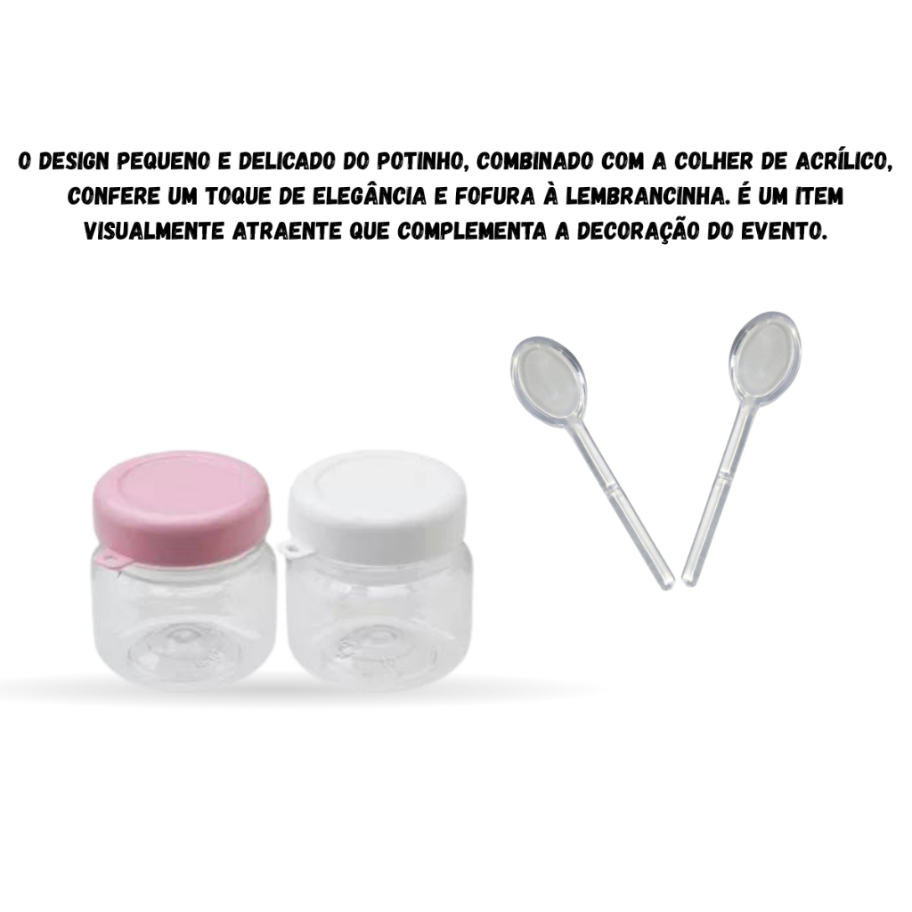 Mini Potinho - Plástico 40gr com colher inclusa Material: Pote PET/ Tampa PP Ideal para doces: brigadeiro, beijinho, doce de leite, creme de avelã, mousse entre outros. Tampa disponível nas cores: Preta Branca Lilás Laranja Azul Bebê Azul Bic Rosa bebê Pink Verde Bandeira Marrom Amarela Vermelha Dourada Medidas Pote: Altura do pote com tampa 4,7 cm Diâmetro: 4,5 cm Medidas para rótulo 2,00 cm altura - 13,5 circunferência Tampa: Diâmetro:4cm Medidas para rótulo na tampa: Diâmetro 2cm Qualquer dúvida sobre o produto estamos a disposição para esclarecer! Para outra quantidade, solicite o link INFORMAÇÕES IMPORTANTE: * Selecione a cor de tampa desejada no campo cores de tampa * A Nota fiscal é emitida automaticamente pelo sistema para os dados já cadastrados. Se precisar de uma nota para outro nome/razão social , você precisa fazer novo cadastro com as informações antes da compra. * Confirme o endereço antes de finalizar sua compra, pois após o pagamento efetuado não conseguimos alterar. * Horário de atendimento: Segunda á sexta-feira - 08:00 ás 17:00 hs. * Os potes seguem vazios e sem personalização * As imagens são ilustrativas