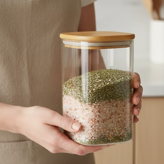 Pote 650ml Vidro Borossilicato Tampa de Bambu Vedação Silicone Porta Temperos