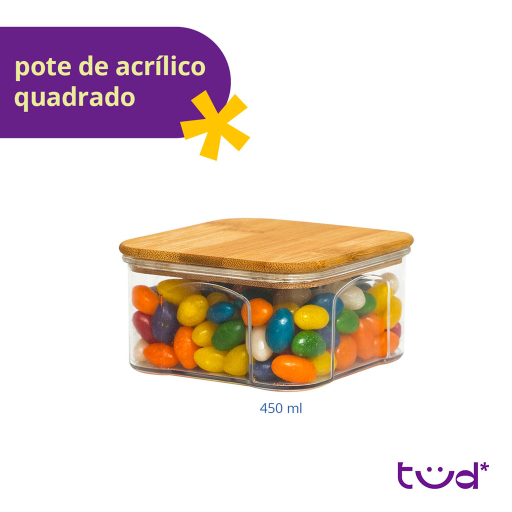 Pote acrílico 450ml com tampa bambu hermético quadrado - Tud
