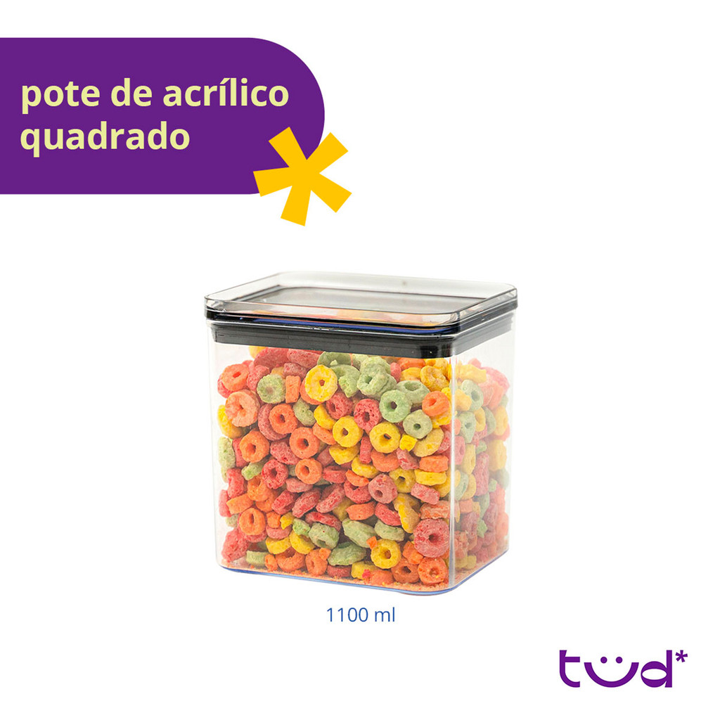 Pote de acrílico 1,1L com tampa hermético quadrado - Tüd