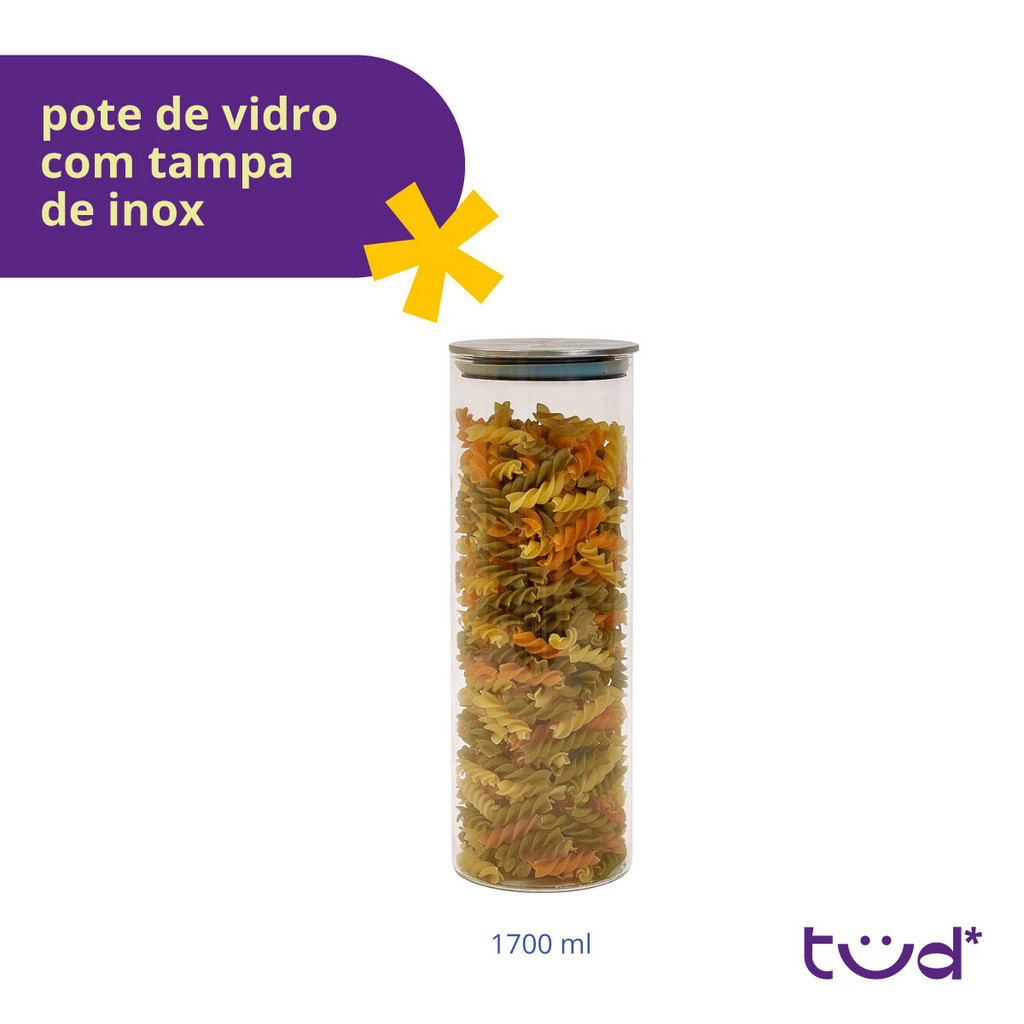 Oii! Tud bem? Vem saber mais sobre o Pote de vidro 1,7L com tampa de inox hermético redondo da Tud! O pote é prático, seguro e decorativo. É bom demais para armazenar alimento, acessórios, itens de escritório ou o que precisar! É de vidro borossilicato, material que não retém gosto e nem cheiro após a limpeza. Além disso, o anel de silicone na tampa garante a vedação, conservando o conteúdo por muuuito mais tempo :) O que ele tem de bom: • Vedação hermética; • Tampa de inox; • Vidro borossilicato; • Design moderno. Material: Vidro borossilicato, aço inoxidável e silicone. Para limpar, basta lavar em água corrente com detergente. Cuidados com seu novo pote: Não utilize a área áspera da esponja para limpar. Pode ir na lava-louças sem a tampa. O pote é Tudbom! Organize sua casa com muuuita praticidade e modernidade. A Tud chegou pra facilitar a sua vida. Somos uma marca brasileira que é tudo de bom! Medidas: Comprimento: 10cm | Largura: 9,5cm | Altura: 27cm O que cabe? 1,1kg feijão | 920g de macarrão parafuso | 1,2kg de arroz