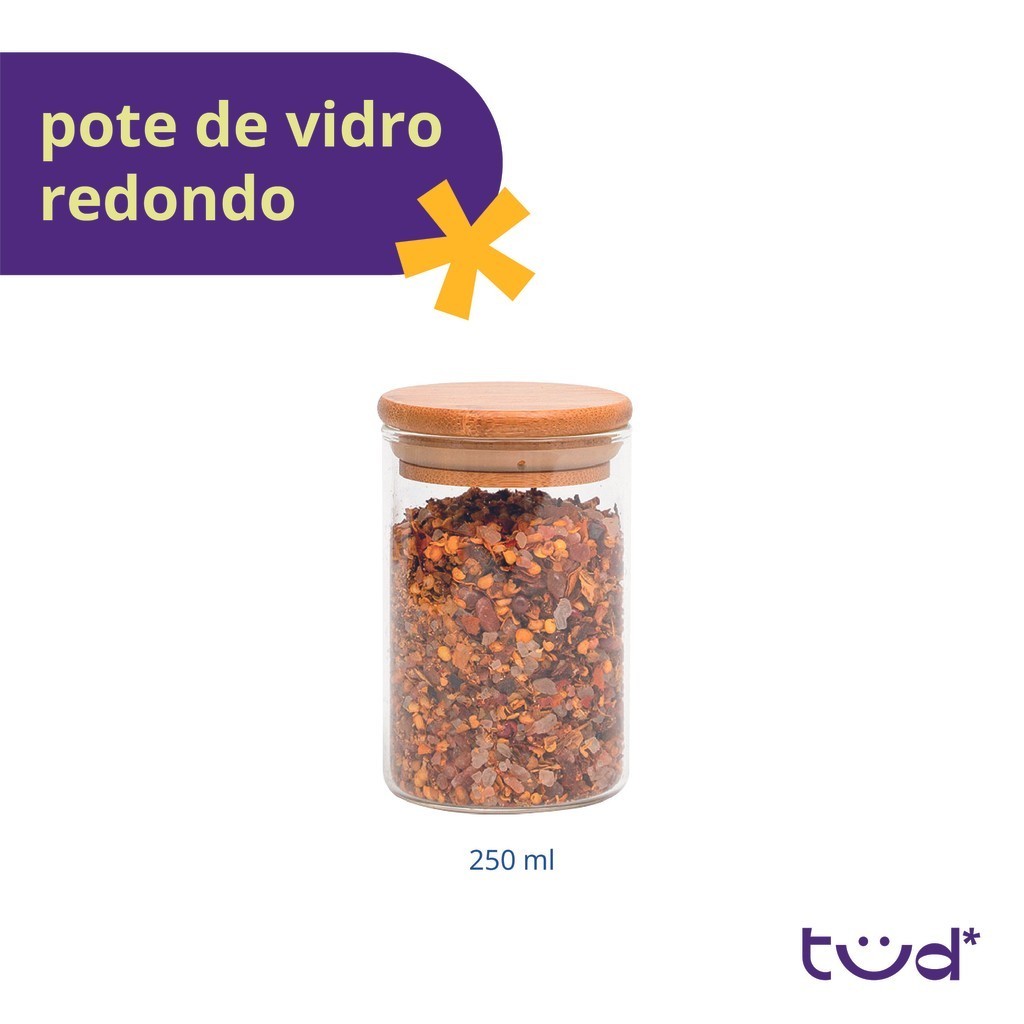 Pote de vidro 250ml com tampa de bambu hermético redondo - Tud