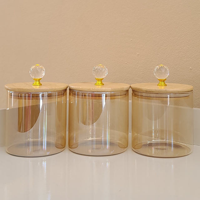 Pote de Vidro ÂMBAR CRISTAL LISO P Luxo hermético com tampa bambu 500ML Cozinha Porta Condimentos